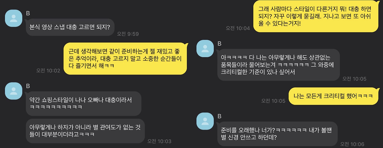 그 후로 B는 결혼 준비에 돌입한다고 했고, 나를 선배님으로 모시겠다면서 개인 톡이 자주 왔는데, 내용이 참 별로였다. 매번 결혼과 관련된 제반 사항들을 대충, 아무렇게나 선택해도 되는 거냐는 식의 질문이었다. 나중에는 그런 질문을 대체 왜 나한테 하는건가 싶어서 한마디 했는데, 한참 지난 내 결혼 준비를 들먹이며 비아냥으로 돌아오는 것이 아닌가.