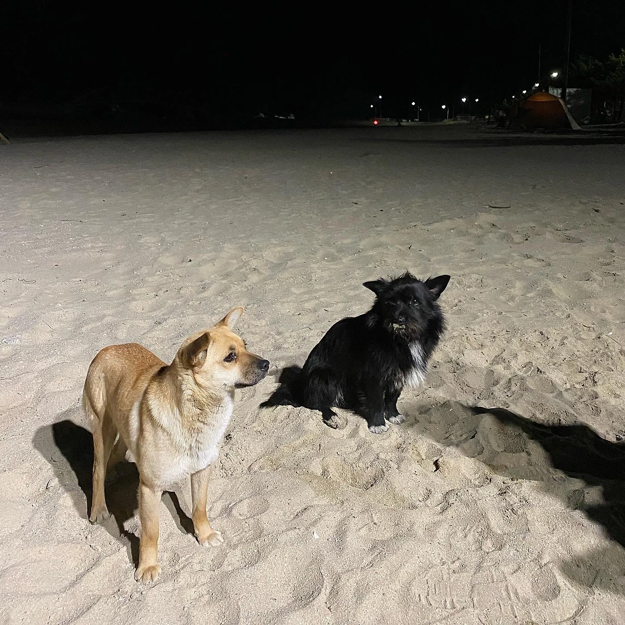 남편과 나는 언제 들어도 마음이 평화로워지는 파도 소리를 들으면서 이런저런 이야기를 나누었다. 평일에 여기저기서 시달렸던 피로가 풀리는 시간이다. 집에 있었다면 넷플릭스나 예능 프로그램을 보는 시간인데, 밖에 나오니 온전히 서로의 이야기에 집중할 수 있어서 좋다. 동네 강아지 두 마리가 고기 냄새를 맡아서 인지 우리 곁으로 와서 재롱을 피운다. 강아지들이랑 같이 사진 찍고 실컷 낄낄거리다 보니, 매일 이렇게 살고 싶다!라는 말이 절로 나온다.