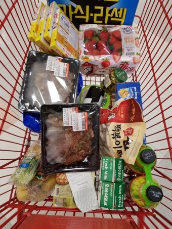 나는 마트 안 다양한 사람들의 카트 속 물건을 보는 취미가 있다.