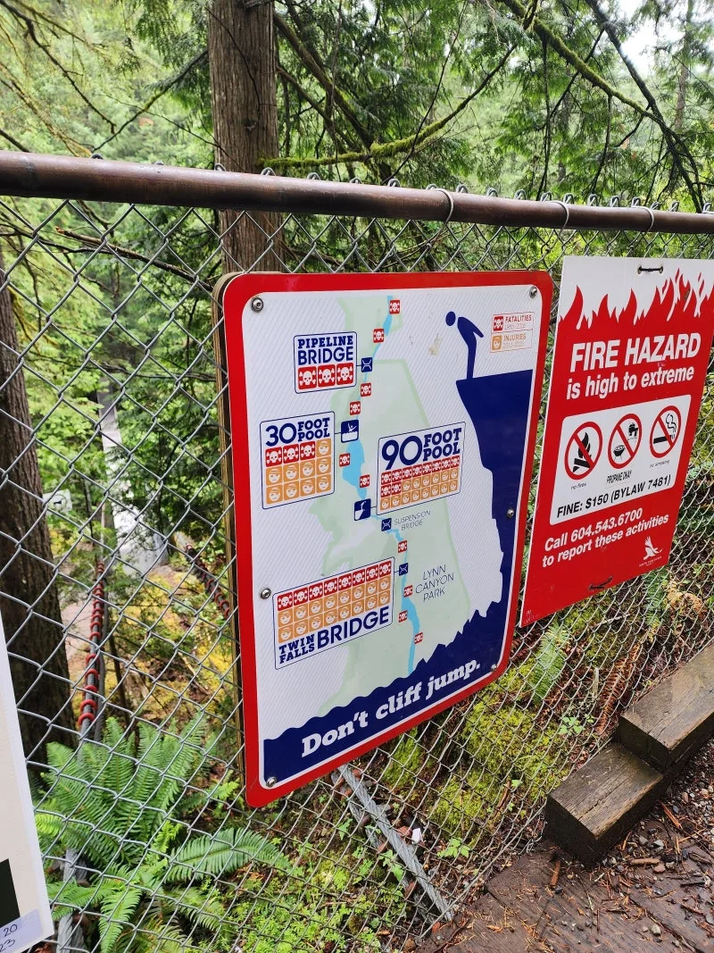 둘째 아이가 좀 더 크고 건강하다면 가족이 함께 정상까지도 가보고 싶은 마음이었지만 추운 날씨에 도착하면서부터 나는 턱을 덜덜 떨면서 이가 딱딱 부딪히는 소리를 내고 있었다. 햇살에 있으면 따뜻하지만 그늘은 너무나 추웠다. 그리고 여기저기 곰이 나올 수 있다는 표지판이 공포스러웠다. 다이빙을 하다가 이렇게나 많이 죽었어라는 표지판도 움츠러들게 하였다.
