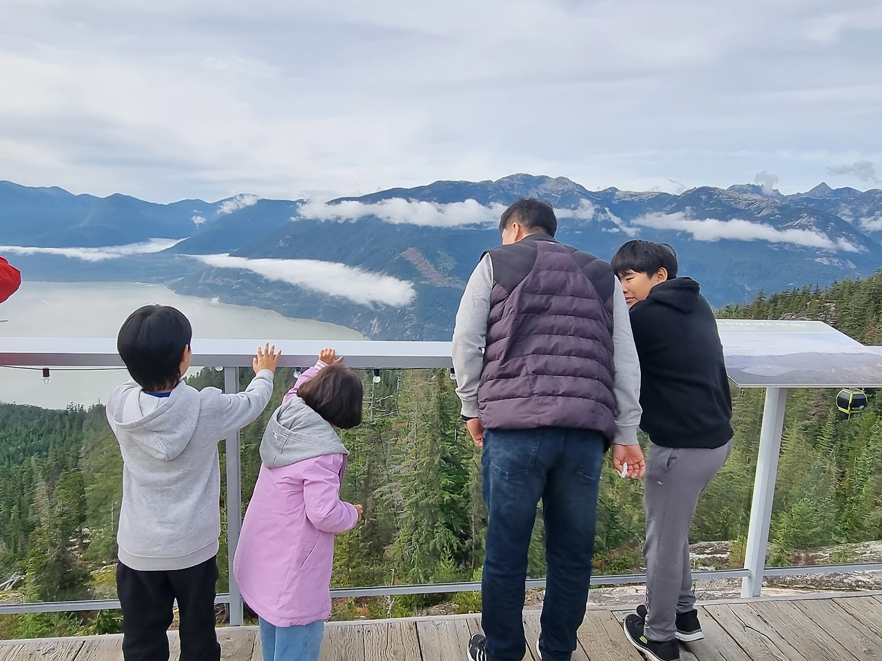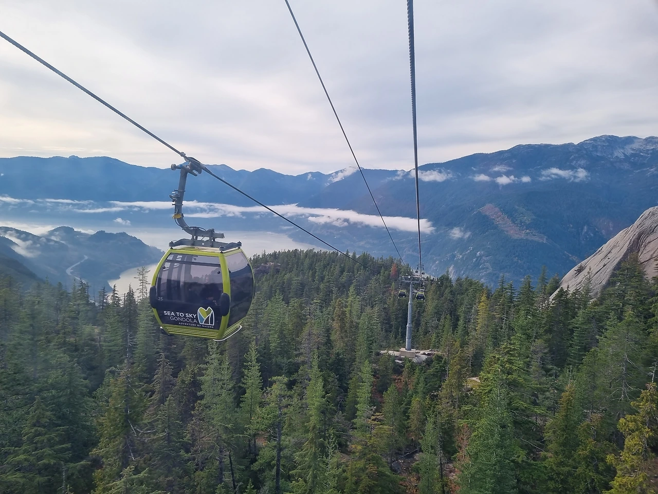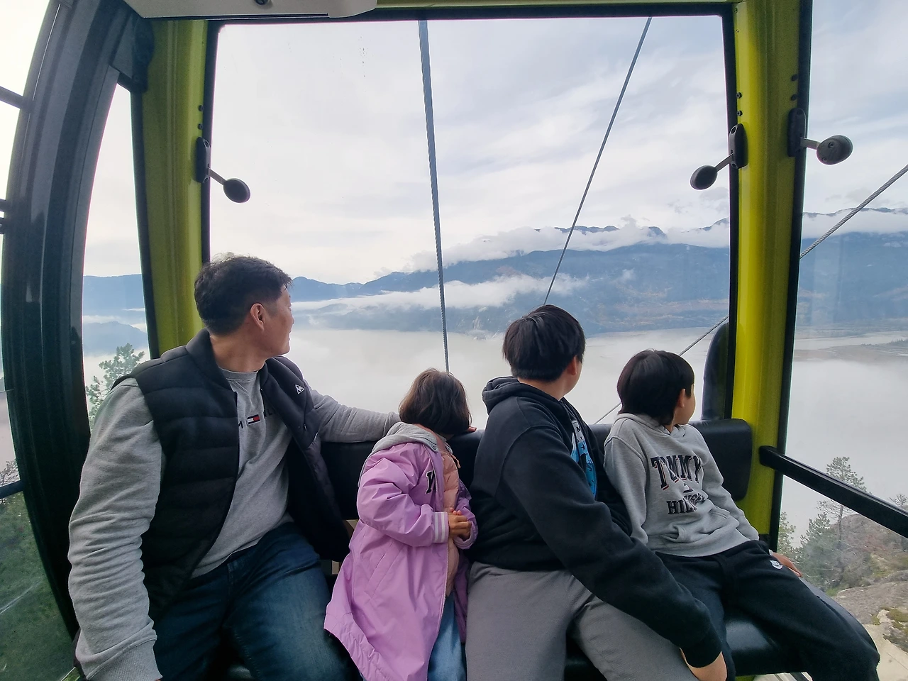 캐나다 여행 블로그에서 자주 못 보던 여행지라서 어머 이런 것도 있었구나 했던 곳이다. 곤돌라 탑승비용이 많이 비싸서 유학생이나 워홀 하시는 분들 입장에서는 부담이 되는 가격이겠구나 하는 생각이 들었다. 지연언니네가 구매해 주셔서 너무나 감사하고 미안한 마음 더하기 황송한 마음으로 탑승했던 씨 투 스카이 곤돌라. 아주 가파른 산을 곤돌라가 빠르게 올라간다. 해발높이가 있다 보니 비행기를 탈 때처럼 귀가 먹먹해지곤 한다. 올라가면서 보는 풍경은 장관이다. 구름이 산마다 신선들이 타고 다니는 모양새로 곳곳에 뿌려져 있다.