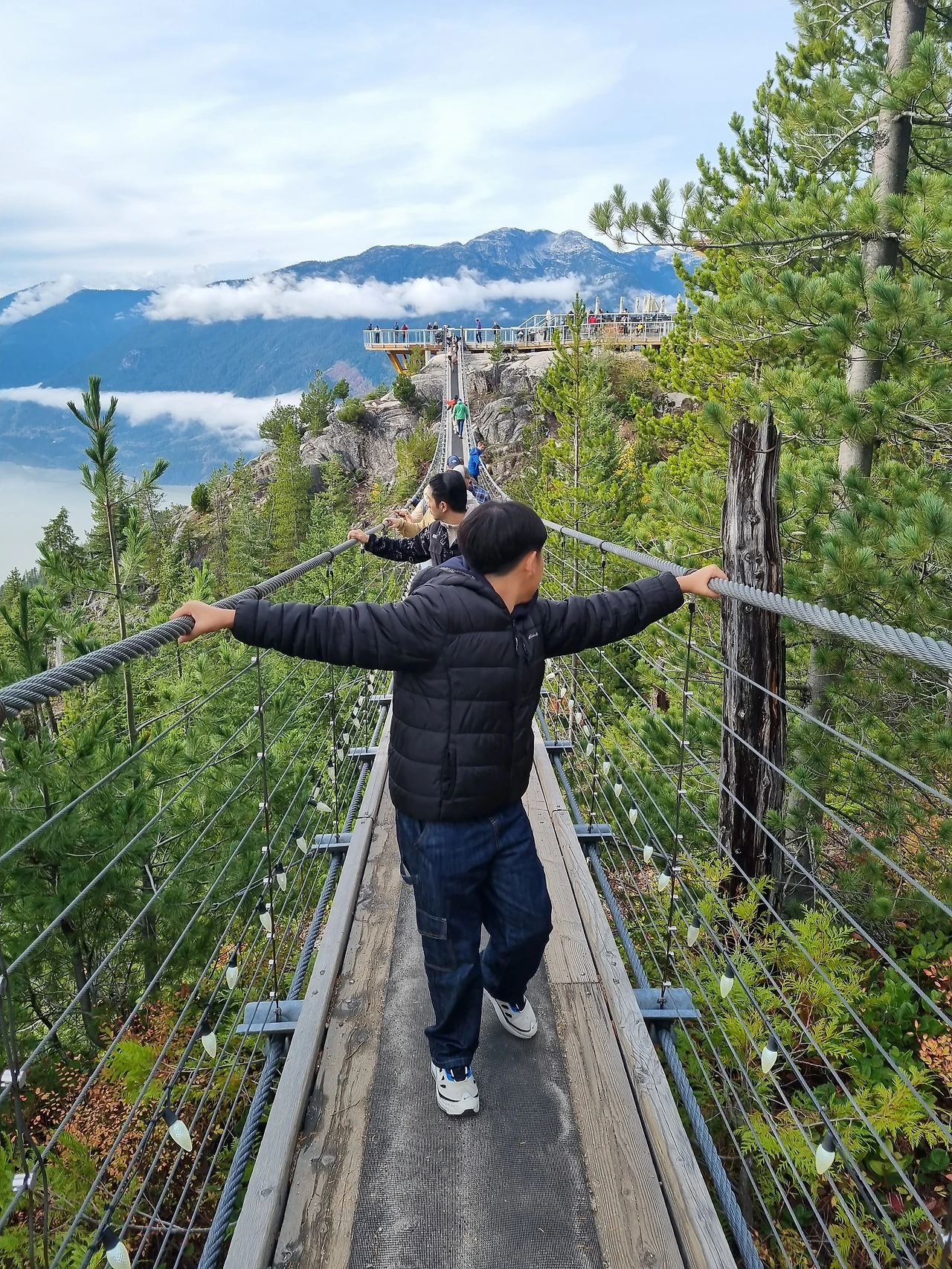 곤돌라를 타고 올라오면 넓은 호수와 풍경을 볼 수 있다. 나는 이 곳 풍경은 항상 저렇게 구름이 멋지게 있구나 했는데 다음날 지나가다 보니 구름은 없었다. 이날 우리를 위해 특별히 데코를 해준 모양으로 구름들이 펼쳐져 있었다. 정상에 올라가면 추운 감이 있다. 커피숍과 빵이 있고 전망대를 지나면 흔들 다리가 있다. 우리 아들은 무섭다고 난리다.