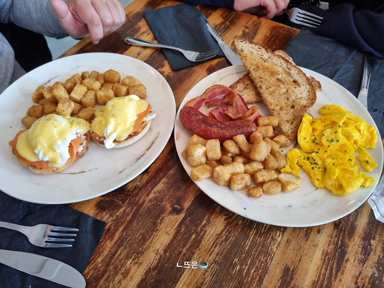 우리 동네 브런치 가게보다는 못한 데코지만 맛이 있었던 아침 식사, 나도 가족에게 저 정도의 브런치는 해줄 수 있지 않나 싶은 자신감이 생기지만 식 원재료가 좋아서 캐나다의 특별한 맛이 있다. 캐나다에 여수 브런치맛집정도 차리면 부자되겠다싶기도 했지만 그러기엔 내자신의 음식솜씨가 똥손이다. 요리로 돈 벌 팔자는 아니다.