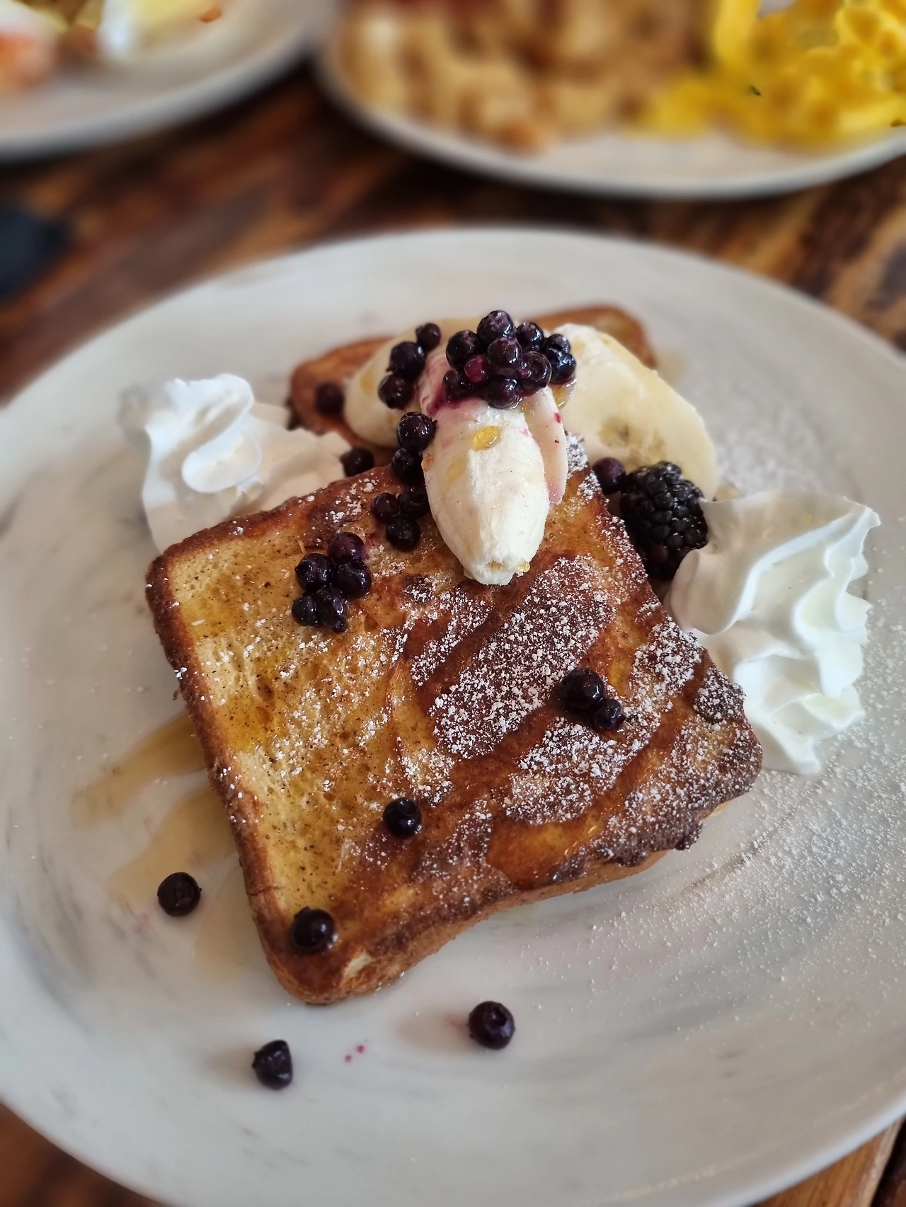하룻밤을 푹 잘 잔 후 아침 조식을 먹으러 갔다. 블랙베리 잼과 바나나 생크림 트렌치 토스트가 대표적인 브런치 음식이다. 감자튀김조차 맛있었던 브런치 가게. 현지인 맛집처럼 캐나다 인들이 가는 식당을 가니 손님도 많고 맛도 좋았다. 블로그 검색이 아닌 현지인들이 북적이는 곳이 찐 맛집임을 알게 되는 시간이었다. 이 식당만의 시그니쳐 음료가 있는지 다들 그걸 마시고 있었다. 계피가 올라간 알코올이 첨가된 음료였나? 다들 먹고 있으니 궁금하기도 했던 음료였다.