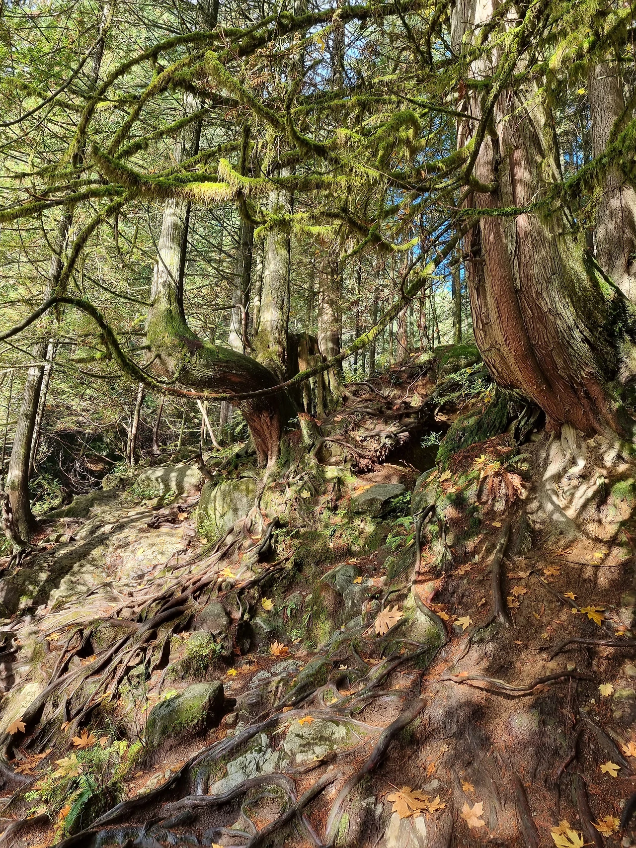일부러 만들어내지 못할 이끼들이 나무를 뒤덮고 있다. 바닥은 축축하고 나무들은 습기를 머물고 있지만 영화 속의 한 장면에 출연하는 마음으로 설레었다. 캐나다의 나무들은 어찌나 큰지 한 번 위로 올라다 보면 나무의 끝을 찾기가 어려울 정도이다. 그 나무들이 그늘을 만들었고 마르지 않고 흐르는 계곡이 습기를 만들어 초록의 이끼가 숨 쉬는 게 느껴진다.