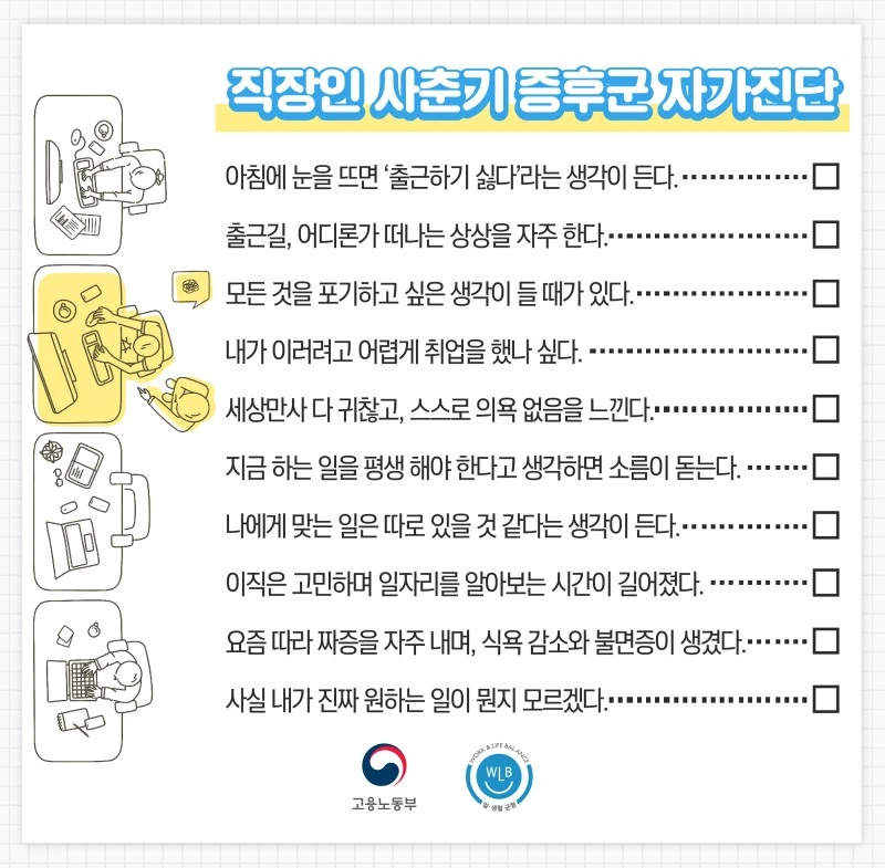 고용노동부에서는 남편과 같은 증상을 직장인 사춘기 증후군이라고 말하나보다. 자가진단 해보라고 해야겠다.출처 고용노동부#사진출처는 네이버와 고용노동부