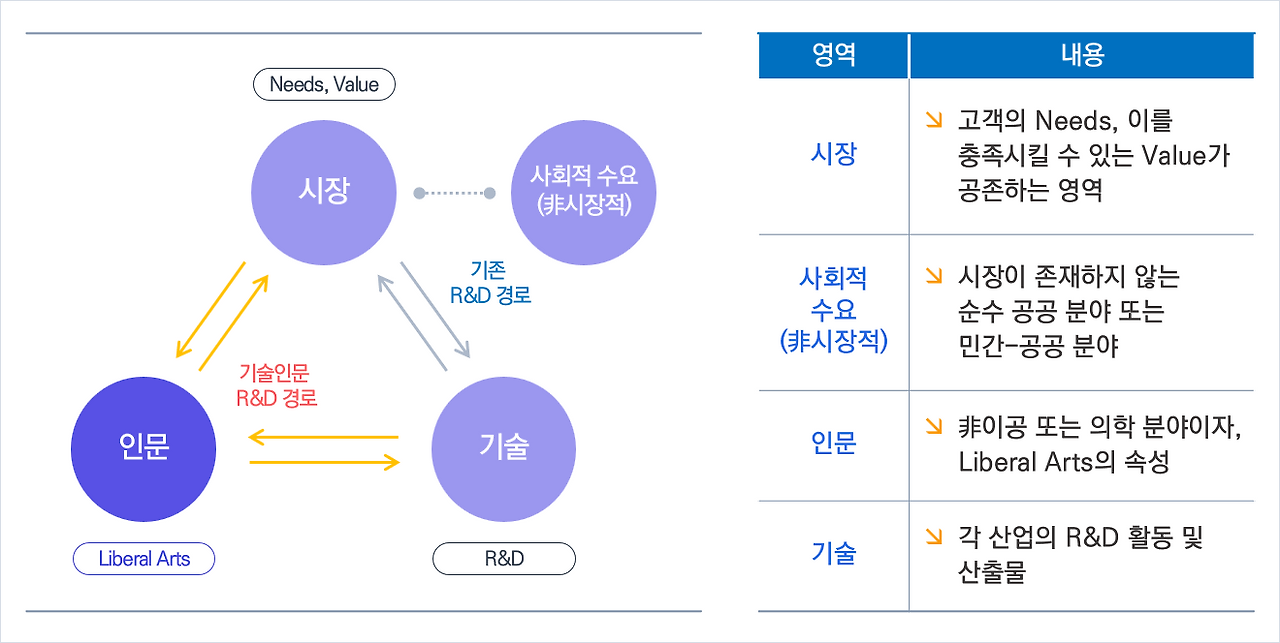 본격적인 분석에 앞서 사업에 대한 이해도를 높이기 위해 「기술인문융합」이 무엇인지, 어떠한 의미로 활용되고 있는지 살펴볼 필요가 있다. 먼저 기술과 인문의 융합은 전 세계적으로 꾸준히 언급되어 온 R&D 정책의 어젠다(Agenda)로, 2000년대 초반부터 미국과 유럽, 영국, 독일 등 주요국을 중심으로 이와 관련한 다양한 국가 프로그램 등을 기획, 운영해 왔다. 다양한 문헌과 연구보고서를 통해 개념과 의미를 확인할 수 있는데, 간단히 정의한다면 “제품, 서비스 등의 산업혁신과 기술혁신을 위해 기술(R&D)과 시장(Needs, Value) 두 요소 간의 관계에 인문학적 요소(Liberal arts)가 더해지는 현상”으로 설명할 수 있다. 여기서 Liberal arts란, ‘인간을 이해하기 위해 다루는 지식’이라는 의미로 활용되는 용어이다.