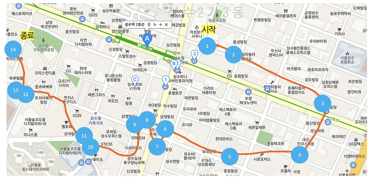참고로 아래는 최근 진행한 성수 투어 루트(4시간 버전)입니다.