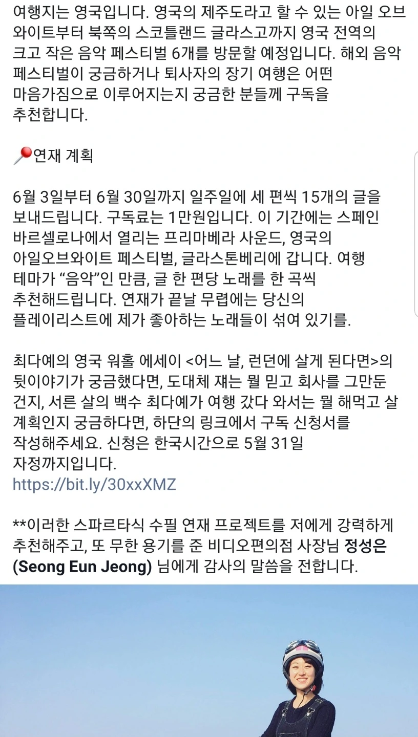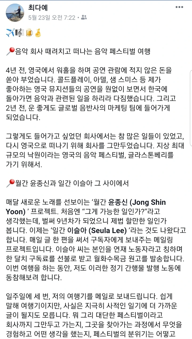 <음악 회사 때려치우고 떠나는 음악 페스티벌 여행>도 그중 하나다. 페친 정성은 님 타임라인에서 보자마자 그 자리에서 신청했다. 그 콘텐츠에 관심이 있었다기보다, 이런 시도를 지지하고 싶었다.(물론 콘텐츠도 좋다!ㅎ)