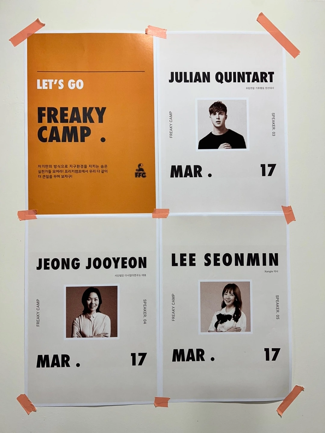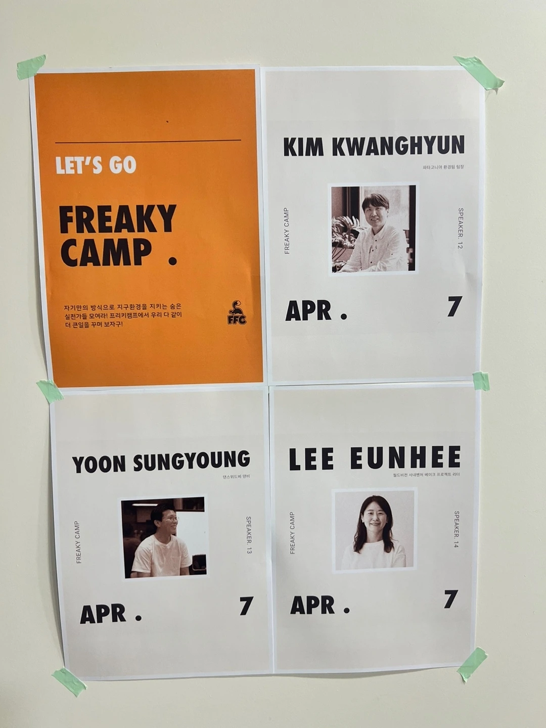 우리의 첫 번째 프로젝트로 6주 과정의 캠프를 준비했습니다. 사람들의 관심을 모을 이벤트로 환경 관련 강연을 열면 그것에 관심있는 분들과 만날 수 있겠다는 생각이었습니다. 그렇게 FFC 환경 커뮤니티 프로젝트는 시작되었죠.
