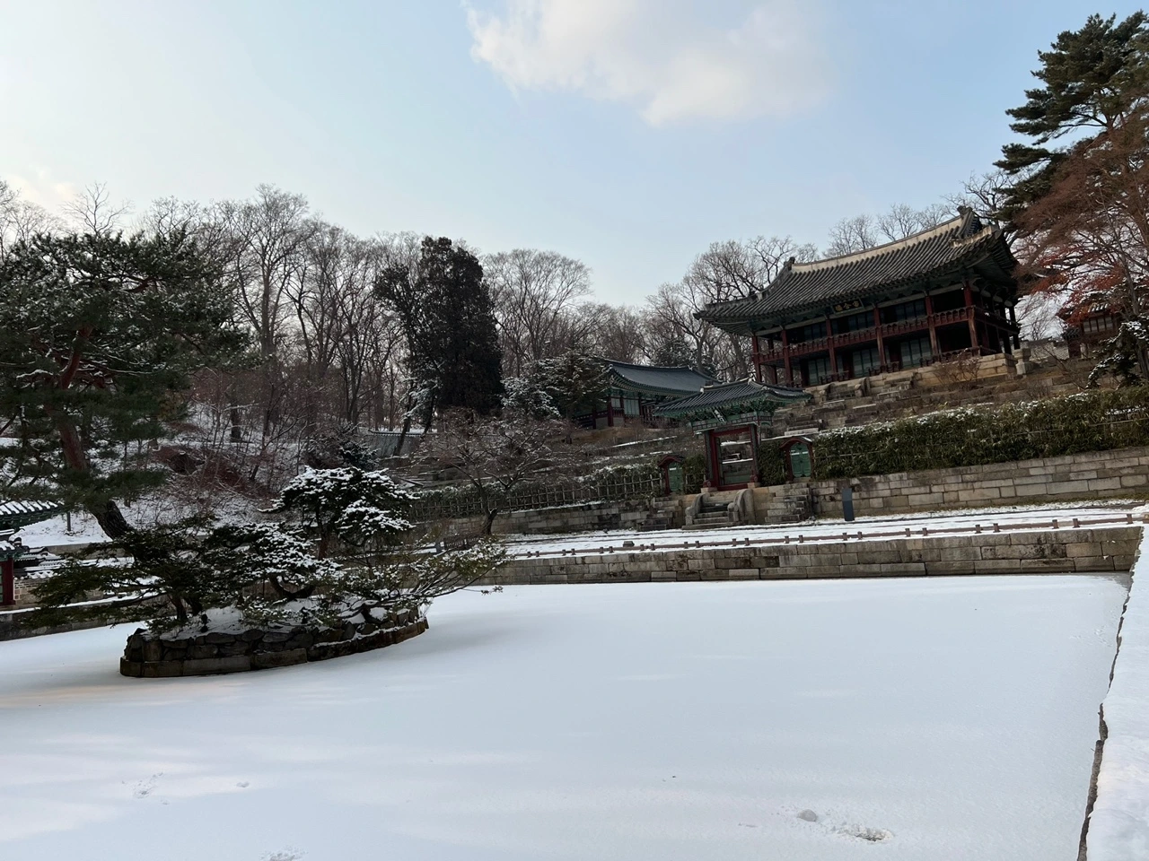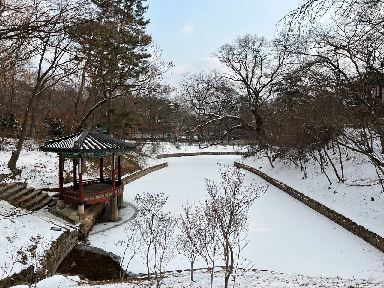 *한참을 걸어, 후원 입구에 닿았다. 그런데 닫혀 있었다. 그때가 약 3시 20분. 입구에 있던 관리자님은 시간이 많이 지나, 입장이 안된다.. 했다. 사정사정했다(아이 엄마와 첫째가 들어가 있다. 우린 예약을 했다. 그런데 오는 중에 아이가 잠들어~블라블라블라). 아저씨는 어디론가 무전을 보냈다. 내가 설명한 상황을 그들에게도 공유했고, 문을 열어줬다. 감사합니다!! 후다다다닥~ 달렸다. 저어어어어멀리 무리가 보였다(개별 관람이 아닌 가이드를 따라 단체관람만 가능하다). 눈 덮인 후원에서 극적 가족상봉! 가이드와 함께하는 후원 투어는 1시간 정도 진행되었다. 후원 관람 후 날씨가 좋아, 창덕궁 곳곳을 다녔다.