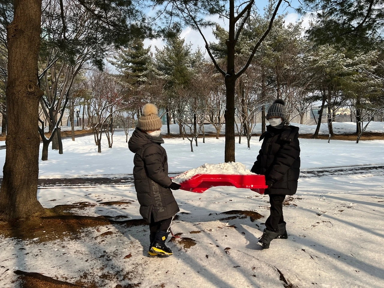 * 그런데 전날부터 눈이 쏟아졌다. 그야말로 함박눈. 오전 9시에 출발하려던 계획이었는데, 눈앞에 눈뿐이었다. 전시회 관람은 미뤘다. 아침 먹고, 아이들과 집 앞 공원에서 눈놀이를 했다.