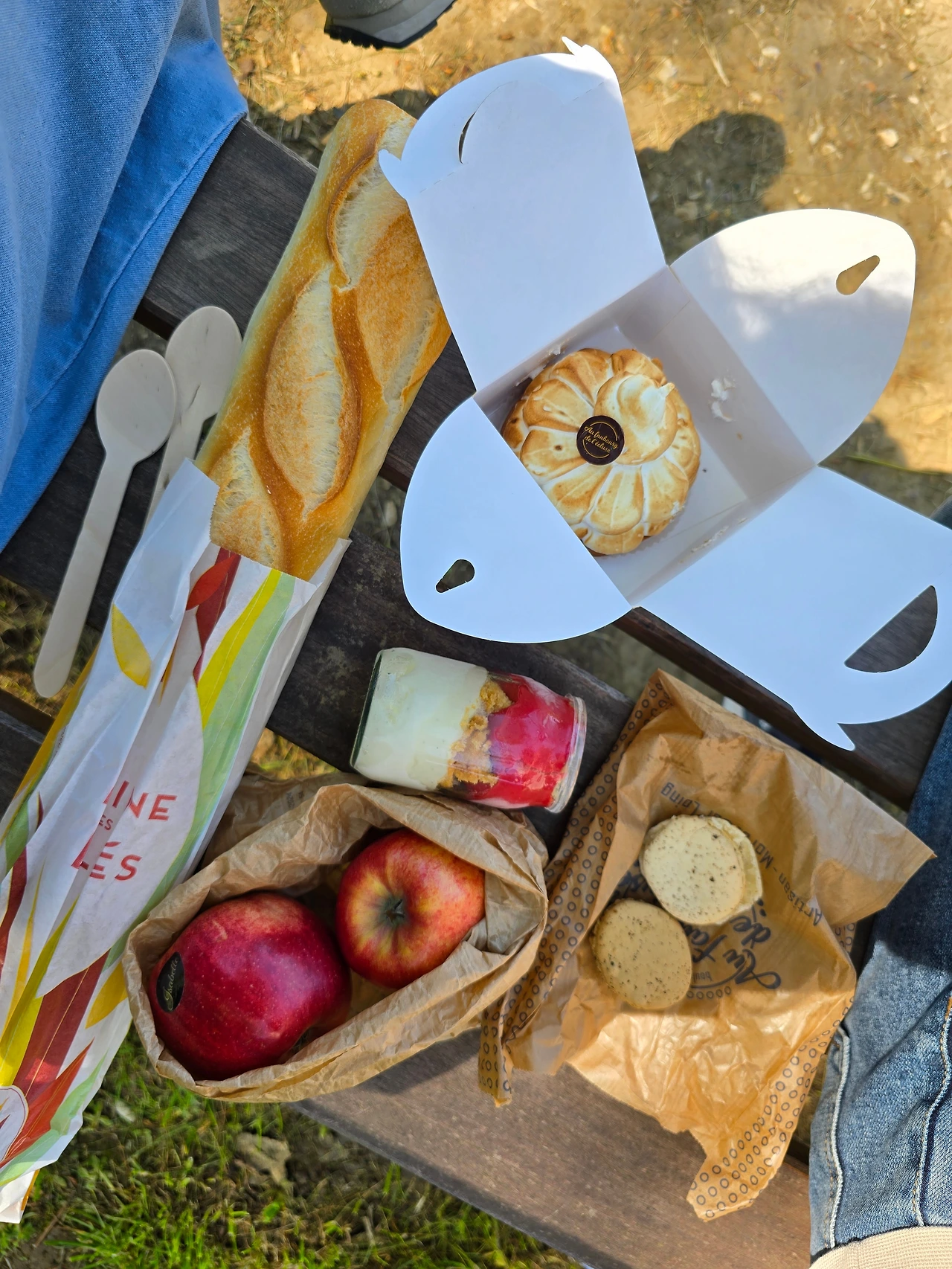 우리는 따로 챙겨 온 담요가 없어서 벤치에 앉아서 먹었다. 같이 온 친구는 제과점에서 산 빵을 먹었고, 나는 어제 시장에서 산 사과와 마을 입구에서 산 바게트를 먹었다. 슈퍼를 찾지 못해서 잼이나 버터는 사지 못했다. 뭐, 프랑스 바게트는 그냥 먹어도 맛있으니깐!