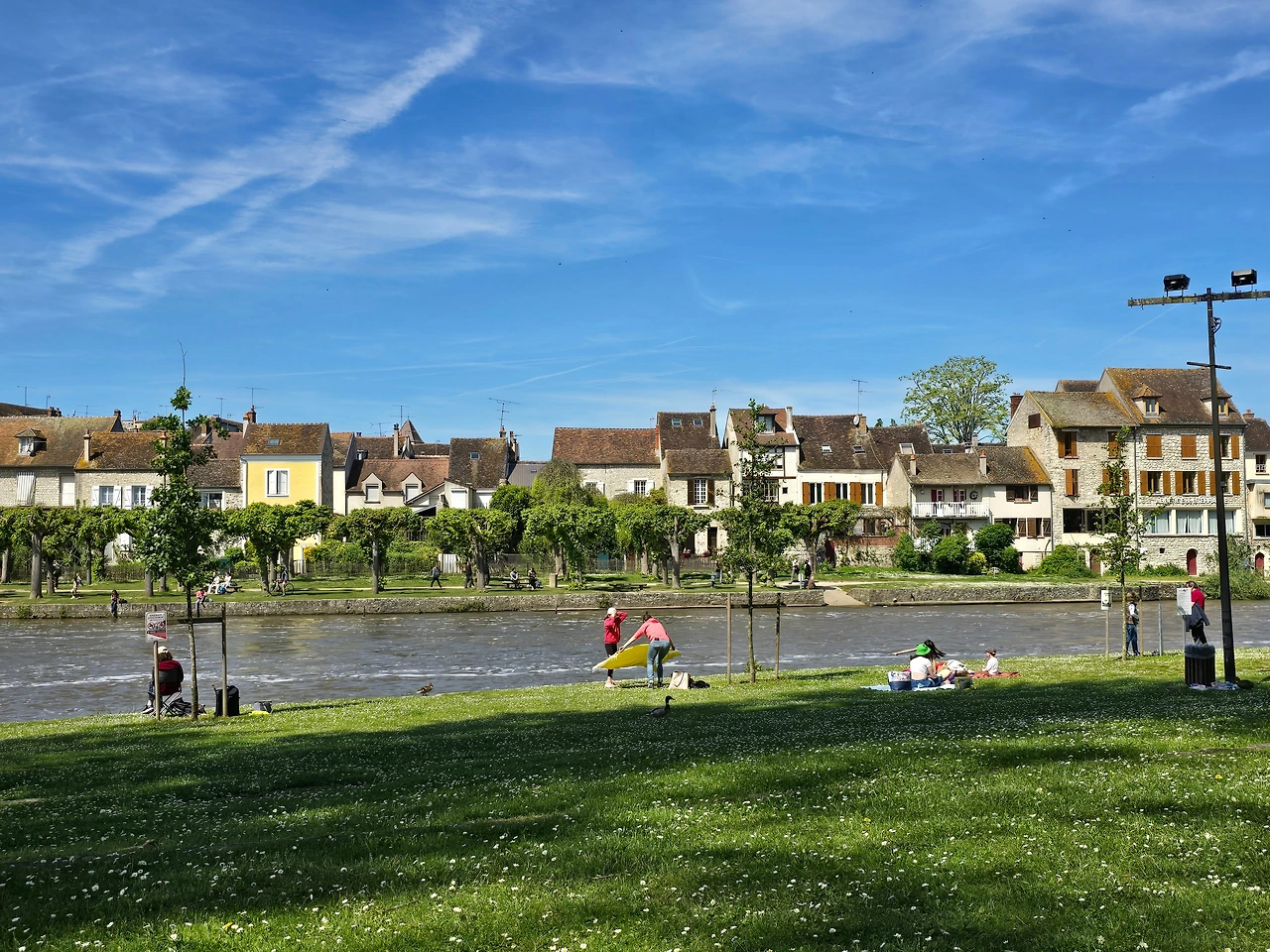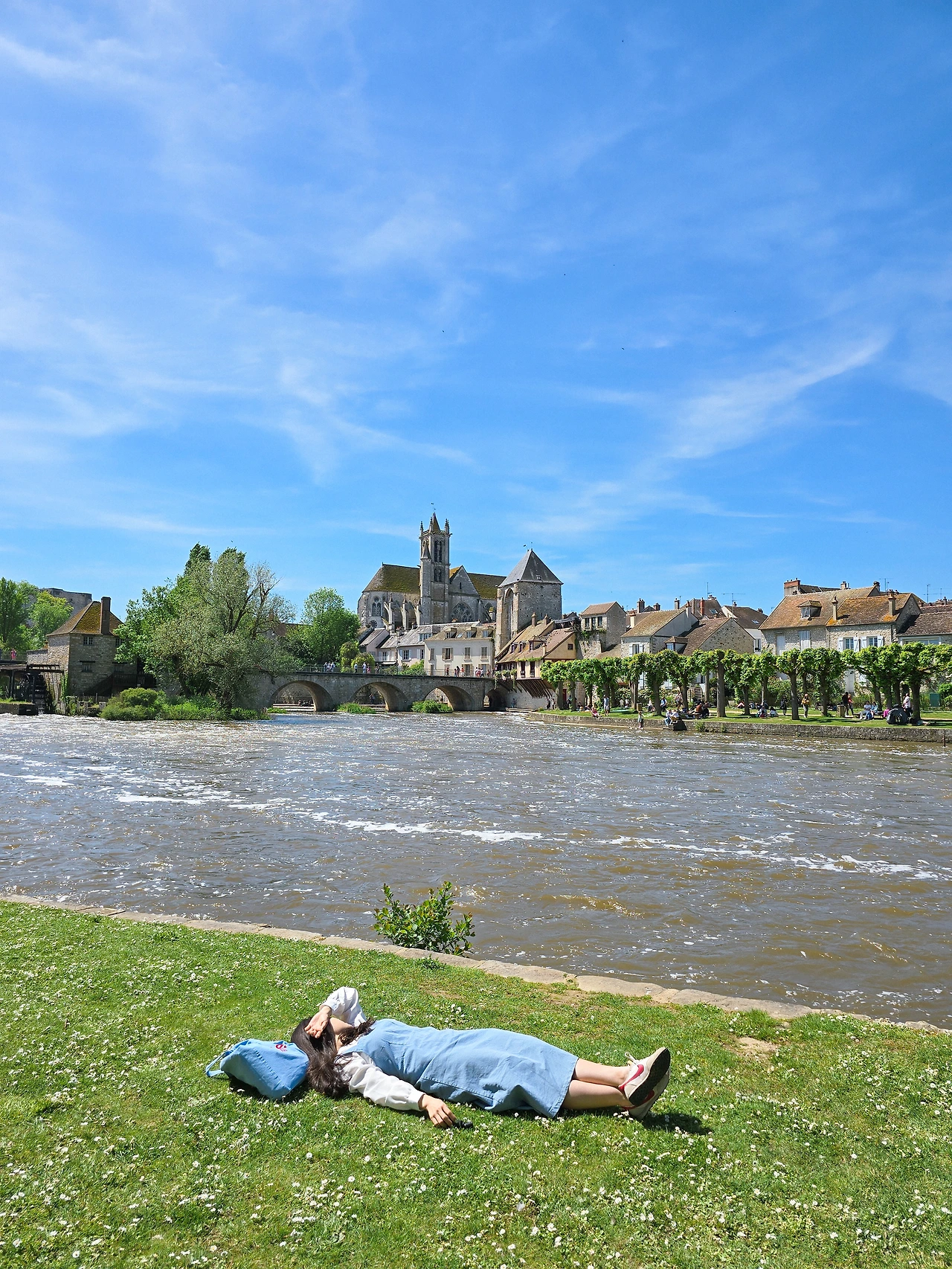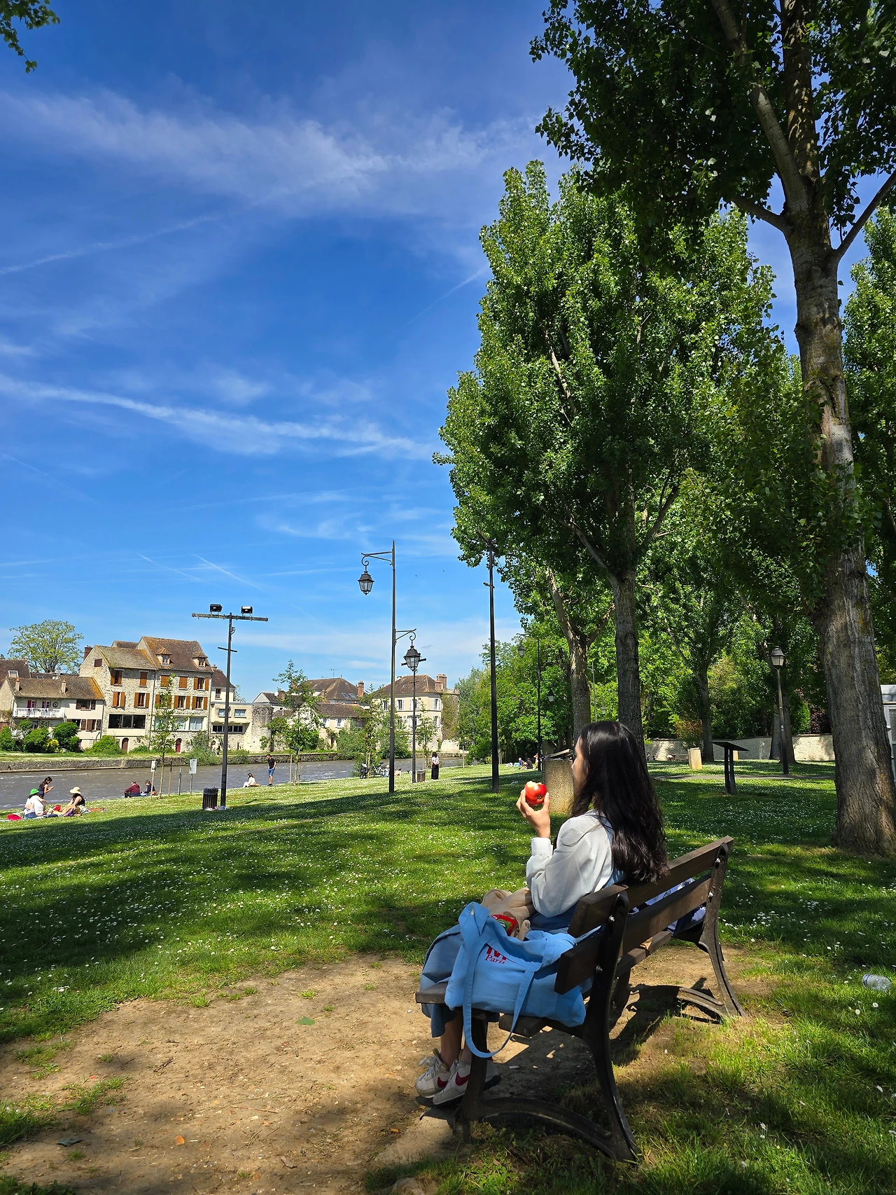 사과를 한 입 베어 물었는데 정말 달콤했다. 프랑스 사과는 유독 맛있는 것 같다. 아삭아삭하고 상큼하고 깔끔했다. 벤치에 앉아서 사과 하나를 아삭아삭 먹으며 눈앞에 펼쳐진 모레 쉬르 루앙의 풍경을 바라봤다. 물살이 빠르게 흐르는 강을 바라보고, 살랑살랑 부는 바람도 느끼고, 흔들리는 나뭇잎을 바라봤다. 가족들이 와서 하나 둘 돗자리를 펴고 자리 잡는 모습도 눈에 들어왔다.