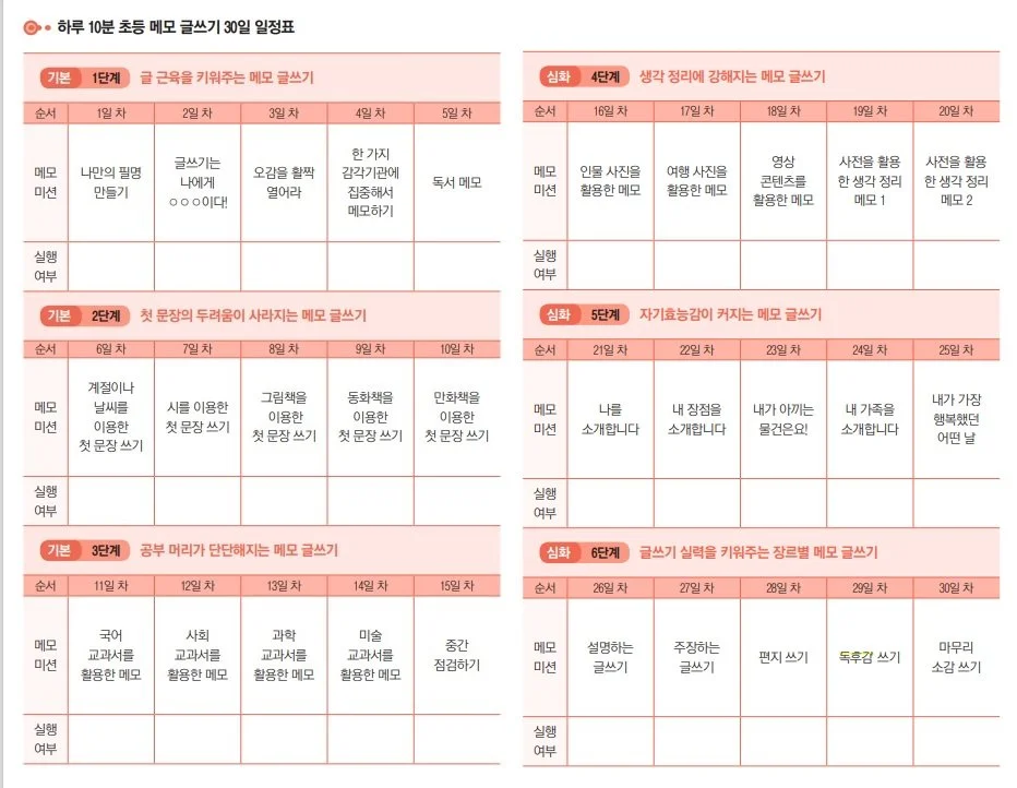 하루 10분 초등 메모 글쓰기 30일 일정표 중