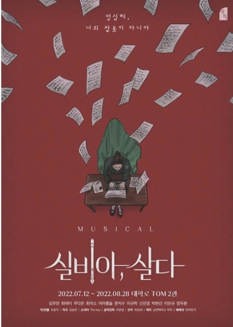 얼마 전 창작 뮤지컬 [실비아, 살다] (대학로 티오엠 2관, 8월 28일까지 공연)을 우연히 보게 되었다. 미국의 시인이자 소설가였던 실비아 플라스(1932~1963)의 삶을 다룬 뮤지컬로, 실비아 플라스는 영국에서 가장 사랑받는 시인(BBC 선정)이자 ‘야수적인 표현’, ‘거친 언어’로 자신의 생각과 감정을 표현한 작가로 죽음 이후에 작품의 예술성을 평가받아 사후에 퓰리처상을 받은 유일한 작가이기도 하다.
