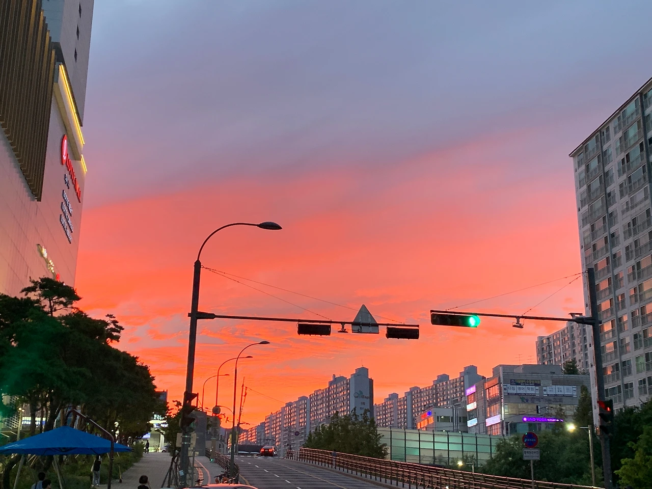 이번 추석 때, 우리 동네의 해 질 녘 하늘은 몹시도 붉고, 아름다웠어요. 바다와 한라산이 있는 제주에서 빌딩숲이 가득한 곳으로 떠나오는 명절. 뭔가 거꾸로인 것 같아 명절 기분은 제대로 안나지만 어쩐지 고운 하늘을 보고 있자니 '고향 하늘이구나'라는 생각이 들어 혼자 조금 웃었네요. 무섭게 높은 아파트들 사이로 붉은 노을이 지는 곳, 고층 빌딩의 유리창으로 그 노을이 비치는 곳, 이곳의 작은 낭만을 찾아서 반가웠어요. 아마, 명절을 기다릴 때마다 이런 뜻밖의 낭만들도 같이 떠올릴 수 있겠죠?