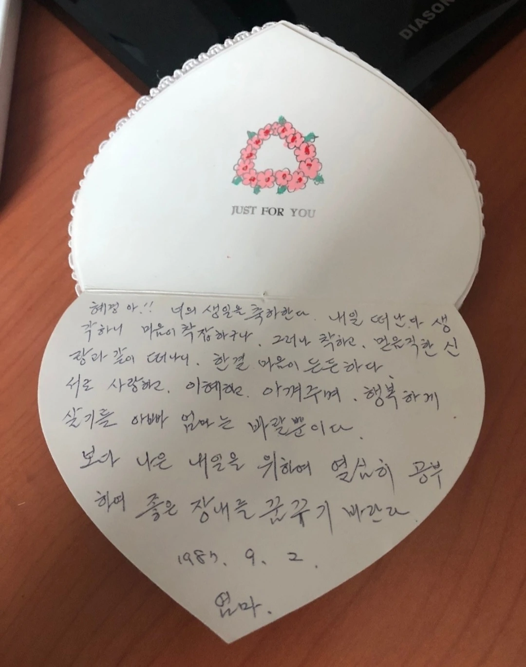 집 정리를 하다 우연히 낡은 상자 구석에서 분홍색 카드를 발견했다. 세월에 빛이 바래 옅은 살구색에 가까워진 하트 모양의 카드. 겉표지에는 ‘For You’라는 단순한 문구가 적혀 있었다.