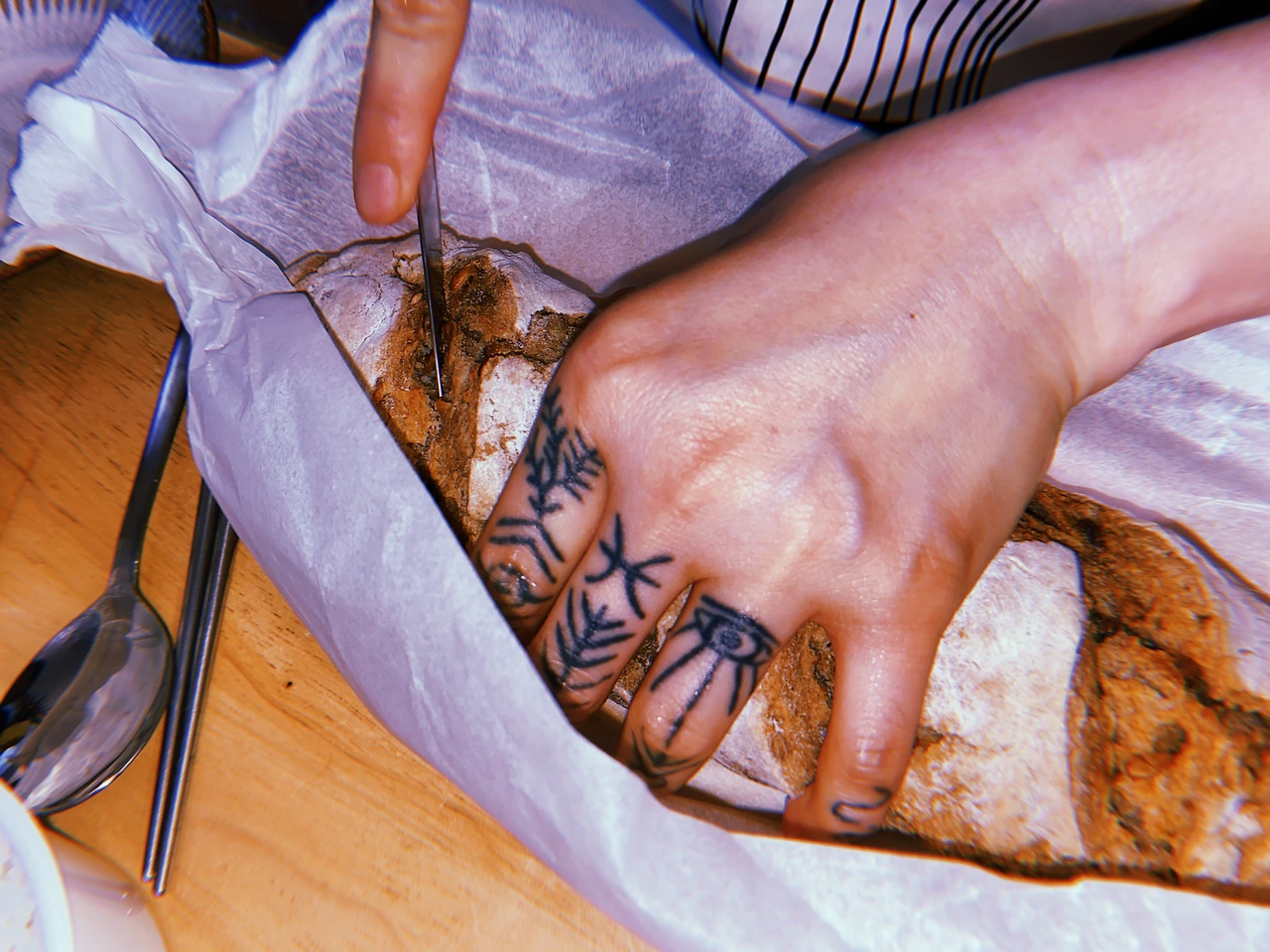 이 친구는 요리를 잘합니다. 오늘은 빵을 구워왔다며, 유산지로 예쁘게 싼 곡물빵을 하나 건넸습니다. 안에는 여러 가지 견과류도 들어갔고, 약간은 사워도우 같은 맛이 나는 빵이었어요. 태국 그린 커리에 찍어먹기도 했답니다. 와인이 조금 있어서 같이 나눠 마시기도 했는데, 술을 마시니 이런저런 이야기가 오갔네요.