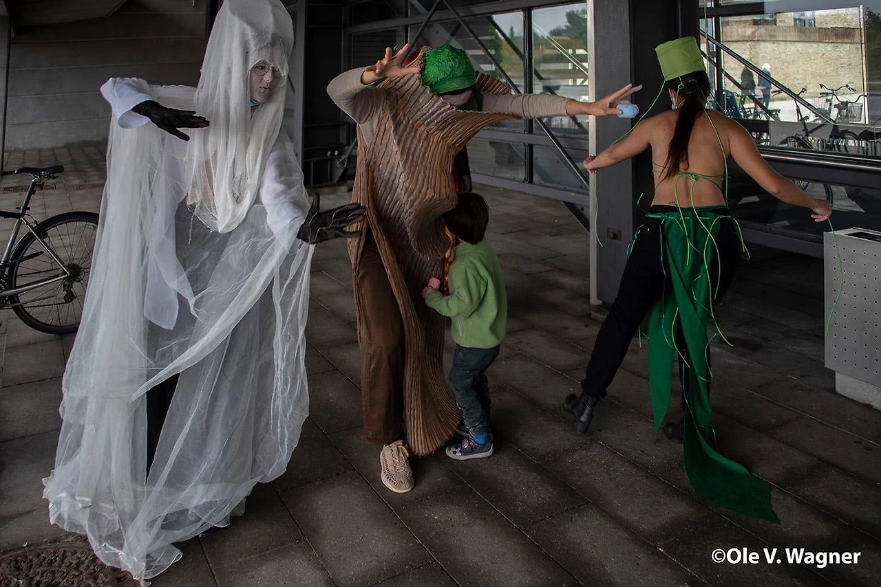 사실 익스팅션 리벨리온과 비커밍 스피시스의 활동에 간간이 참여하는 나의 친구들은 (나를 포함하여) 덴마크의 복지 체제의 혜택을 많이 보고 있다. 실업급여, 학생 장학금, 등등. 정부의 사회적 분배 기능을 통한 최소한의 경제적 수입이 없었다면 그들은 이 액티비즘을 하고 있지 못할 가능성이 크다. 이 사회복지의 혜택을 통해 기후 위기에 의해 고통받는 다른 생물종의 목소리를 대신 내어줄 시공간을 가지고, 그 실천은 이 사회의 구석구석에 퍼포먼스로, 워크숍으로, 다양한 언어와 움직임으로 침투한다. 국가의 복지 제도가 만들어 놓은 틈에서 존재하며, 국가의 선택에 저항하는 기후 액티비즘. 각자의 경제적 상황이 좋지 않을 때, 돈을 벌러 국가와 기업 안에 들어가서 영양분을 채우고 다시 나타나 반란을 도모한다. 한 예로, 비커밍 스피시스는 코펜하겐 시가 추진하고 있는 아마 펠러의 주택건설에 반대하는 운동에 동조해왔다. 그런데 그 코펜하겐 시의 소속 기관 중 하나인 이슬란드 브루게의 문화의 집에서 비커밍 스피시스의 퍼포먼스와 워크샵, 스피시스 앰버서더의 전시를 의뢰하였다. 정부가 정부에 의해서 부정된 상황이랄까. 또 전혀 만날 것 같지 않았던 사회의 행위자들, 공무원과 액티비스트가 협업을 하는 배치가 형성된 새로운 앙상블라주라고 여겨졌다.