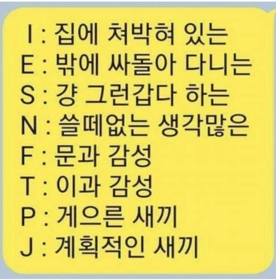 MBTI를 기반으로 하는 심리테스트를 하는 것도 시간낭비라고 여겨서 안 하려고 한다. 당연히 공유해서 편견에 가득한 프레임을 확산시키는 짓은 더 안한다.