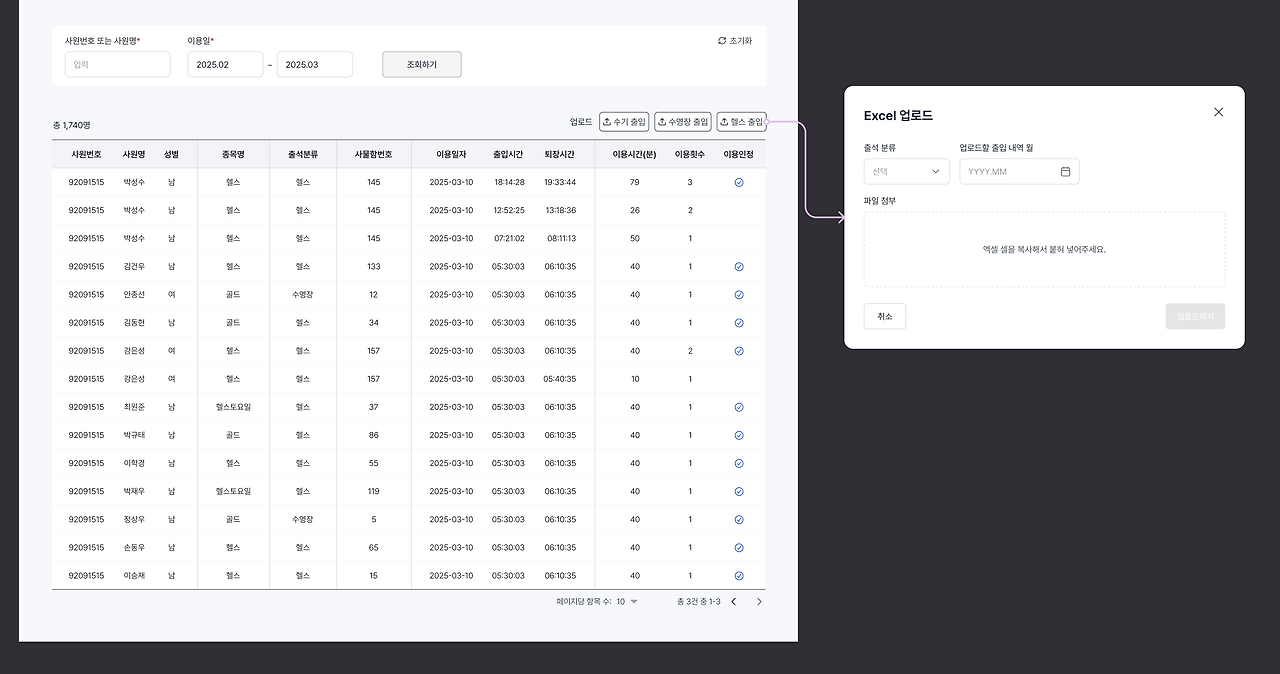 운영자(어드민)은 회원의 출결 데이터를 수영장과 헬스장 각각의 출결포스 업체로부터 엑셀 파일을 전달받는다.