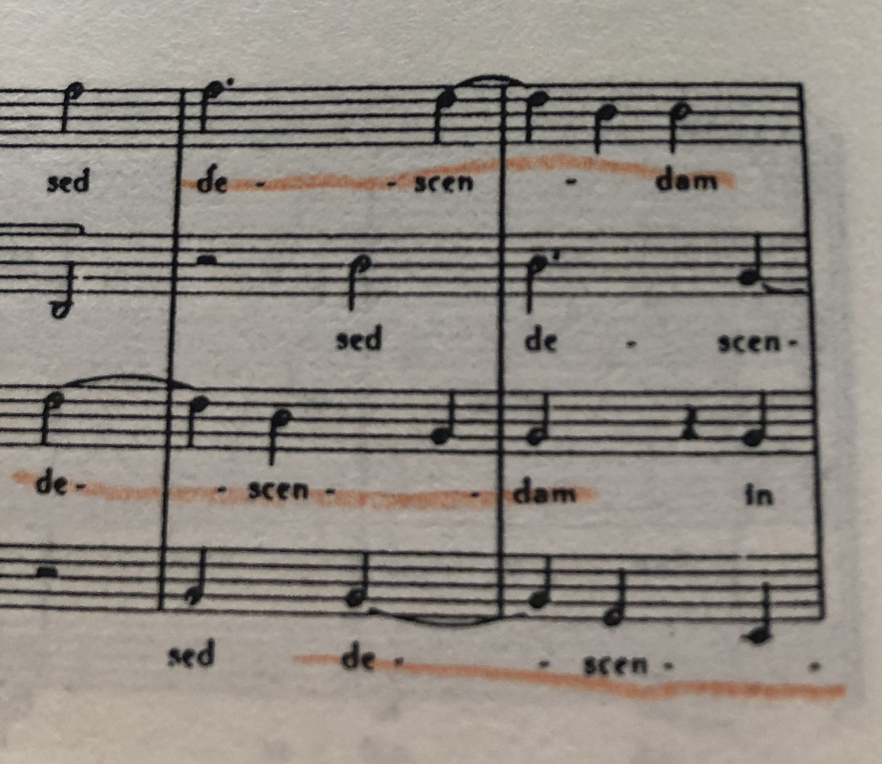 <압살롬> 역시 마지막 구절에 “내려간다(descendam)”라는 가사에 선율이 하강하면서 가사 그리기 기법을 쓰고 있습니다.