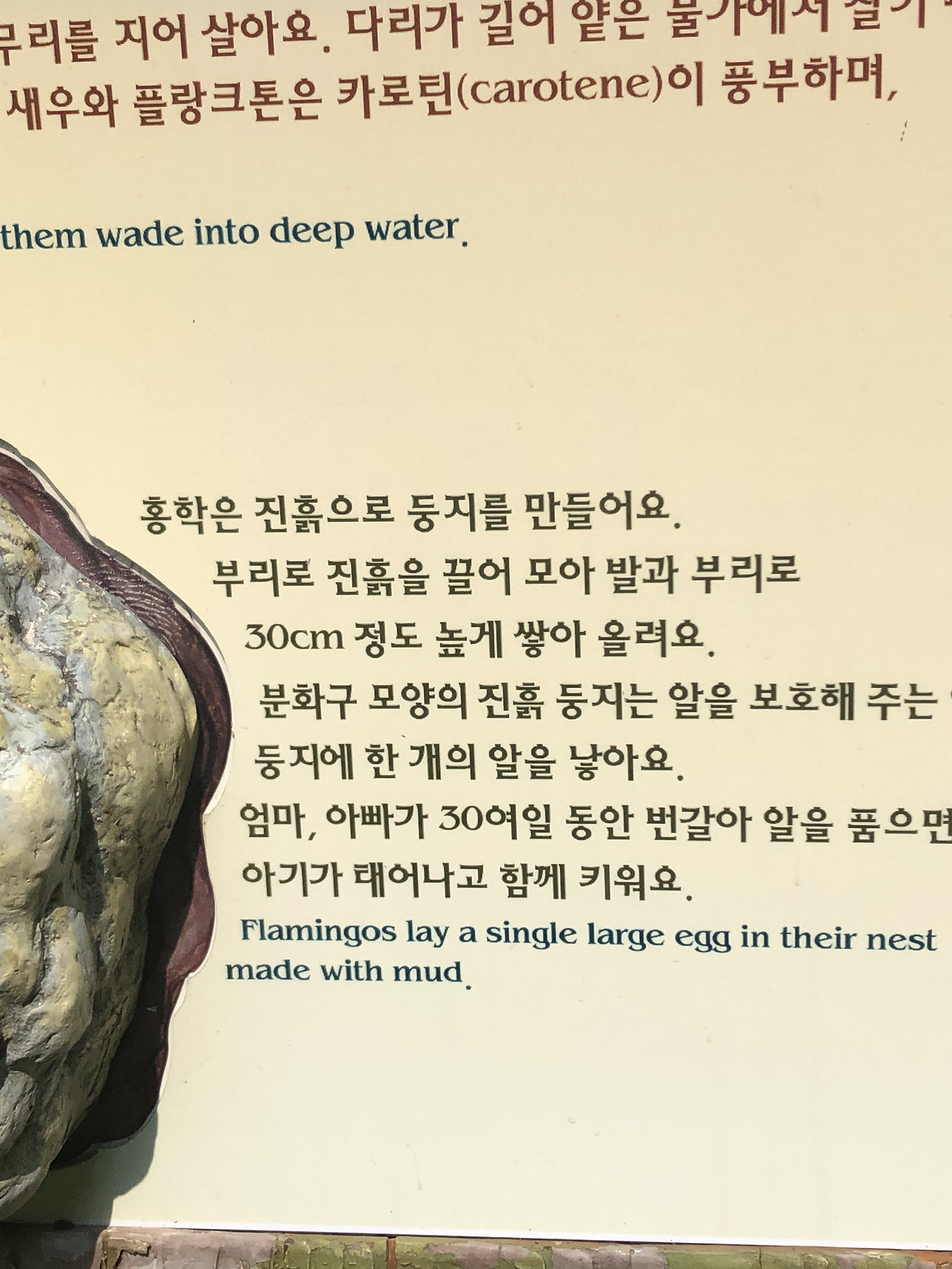 따라서 남편이나 친정부모님 혹은 시부모님이 옆에서 육아를 함께 해야한다. 지난 주 에버랜드 동물원에서 홍학(플라밍고)에 대한 설명을 읽었다. 홍학은 아빠와 엄마가 새끼를 함께 키운다고 한다.