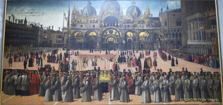 산 마르코 성당 광장의 행진을 그린 벨리니의 그림입니다. 이러한 행진 때 음악도 연주되었죠.현재에도 산 마르코 성당은 참으로 화려하고 멋지답니다.
