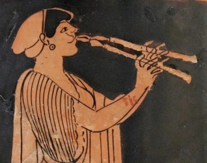 아울로스는 페르세우스가 메두사의 머리를 베었을 때, 메두사의 자매가 슬퍼하는 모습을 표현하기 위해 만든 악기였다고 하지요. 따라서 '인간의 깊은 슬픔과 격정'을 표현한 아울로스는 술의 신인 '디오니소스'를 대표하는 악기가 되었습니다. 실제로 디오니소스 제전에서는 아울로스가 연주되었다고 합니다.