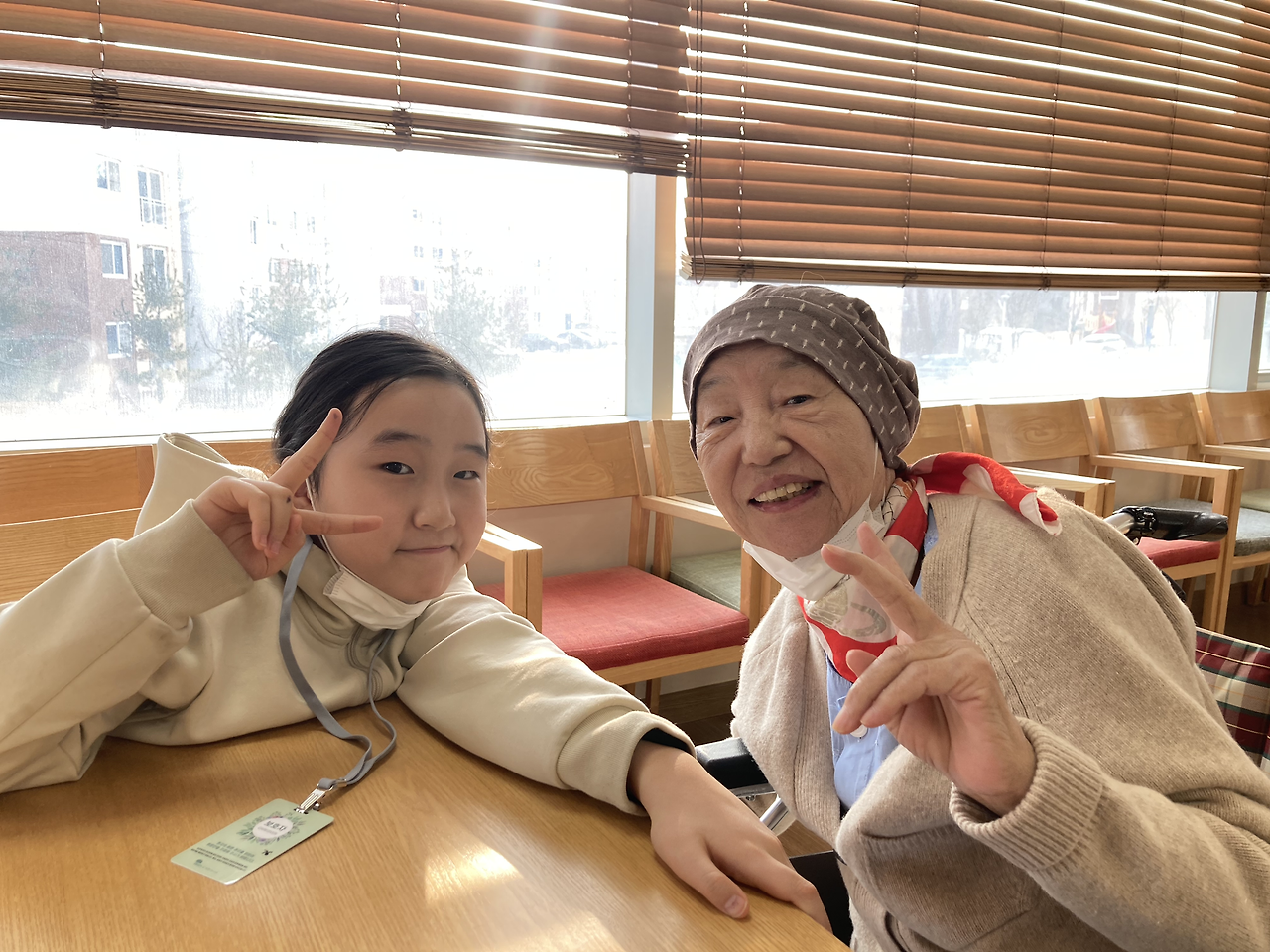 엄마에게 있어 가장 반가운 손님은 나의 두 딸, 즉 손녀들이다. 2-3주 전부터 대면면회가 가능해졌다. 막내를 데리고 갔다. 딱 두명만 면회가 가능하다. 엄마를 만나기 위해선 코를 쑤시는 신속항원 검사를 해야한다. 그쯤이야. 우리 둘은 씩씩하게 검사를 마치고 엄마가 있는 병실 복도 테이블에서 드디어 엄마를 만났다.