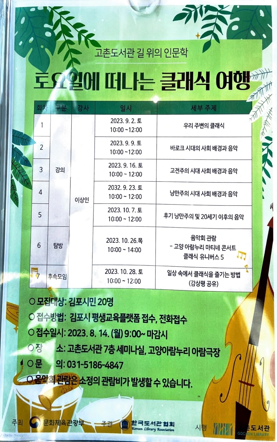 길위의 인문학 프로그램이 선정되어 김포 고촌 도서관에서 5주간 서양 음악사 강의를 하고 6회차에는 함께 음악회를 관람합니다.