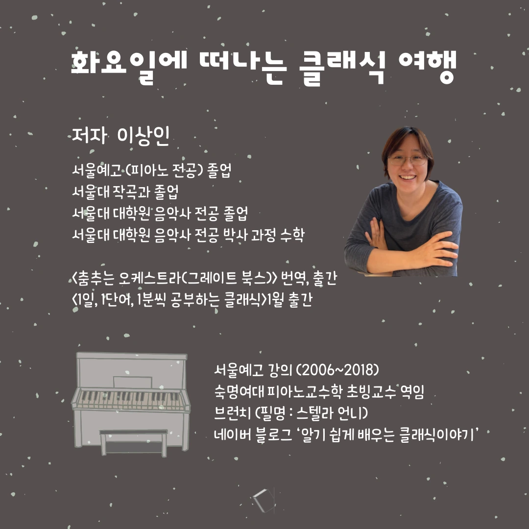 많은 사람들이 다양한 음악을 즐길 수 있길 꿈꾸는 뮤직 큐레이터. <길 위의 인문학> 등 다양한 강연 진행. <1일 1단어 1분으로 끝내는 클래식 공부> 저자