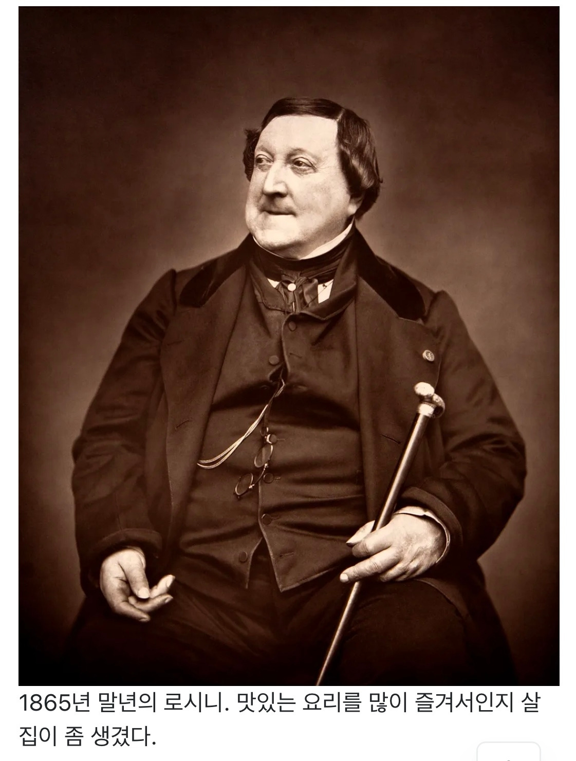 재미있는 사실은 젊은 시절 오페라의 연이은 성공으로 부자가 된 로시니는 37살의 젊은 나이로 은퇴를 하고 요리에 전념했다는 거에요. 그는 타고는 미식가에 대식가였대요. 음식에 관해서라면 요리사보다 더 많이 썰을 풀었다고 해요 ㅎㅎ 그래서인지 말년의 로시니의 사진을 보면 살집이 많이 붙은 모습을 볼 수 있어요.
