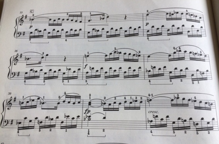 언뜻 악보를 보아도 b,# 등이 많이 나오며 조성이 복잡해졌지요? 밝은 곡이 단조의 어두운 선율로 변하는 부분입니다.
