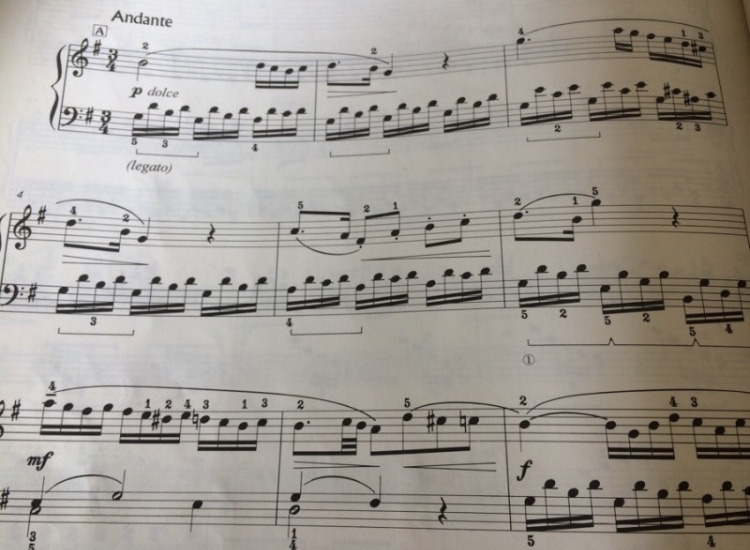 2악장의 음악도 아리아처럼 작곡됩니다. 맨 먼저 A선율이 나옵니다. 안단테라고 써 있는 곳 바로 아래 A라는 표시가 있습니다.