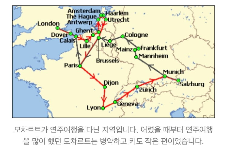 그의 천재적인 재능을 알아본 아버지는 모차르트를 데리고 유럽 전역으로 연주여행을 다녔습니다. 요즘으로 치면 일종의 프로모션 활동을 한 것이지요. 신동 음악가 모차르트를 유럽 전역의 궁정에 소개하고 훗날 안정적인 일자리를 얻게 하려는 아버지의 계획이었습니다.