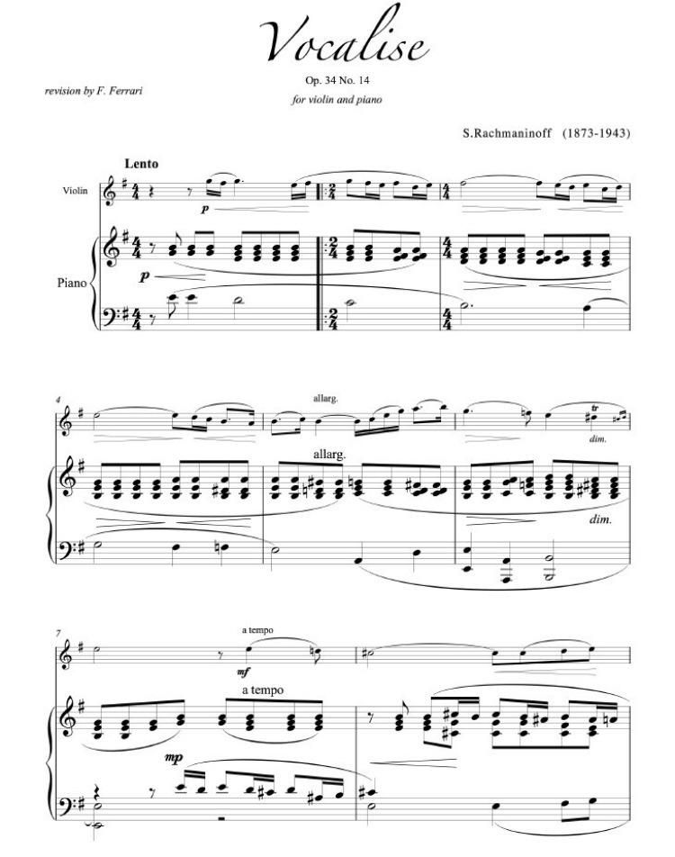 보칼리제의 악보입니다. 윗줄에 나온 바이올린 선율을 보시면 고전 주의 시대처럼 딱히 4 또는 8마디로 나누기 애매합니다. 아래 동영상으로 확인해보세요
