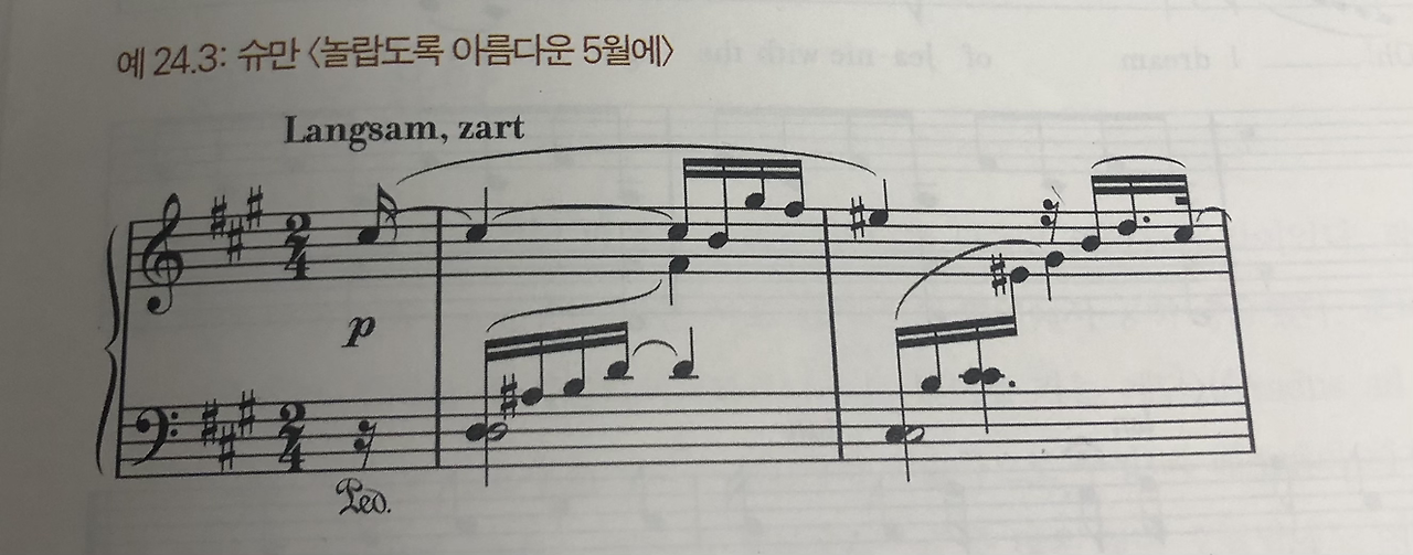 슈만은 성악과 피아노는 동등한 파트너라고 생각했습니다. 따라서 피아노를 단순하 노래에 반주만 하는 파트라고 생각하지 않았지요. 꽤 긴 피아노 전주, 간주,후주를 사용하여 노래의 내용과 분위기를 표현합니다.어떨 때는 피아노가 더 중시되어 성악곡이라기보다 피아노곡에 성악이 얹어진 느낌을 주기도 합니다