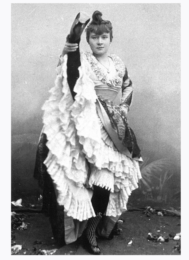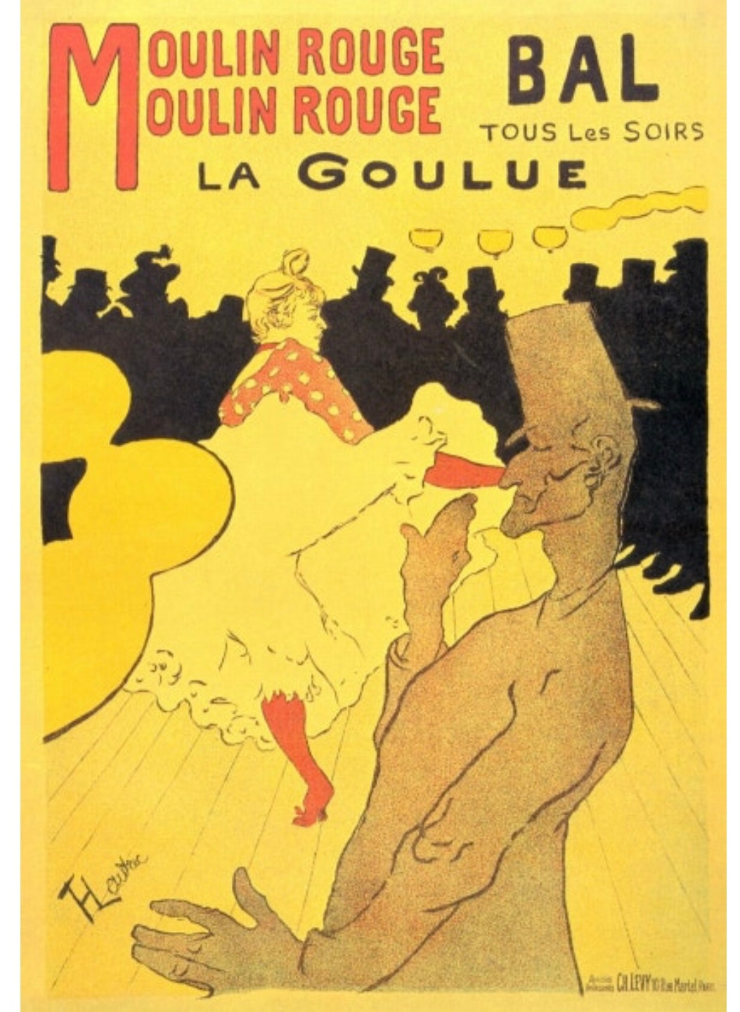 당시 캉캉 무용수로 유명했던 라 글뤼의 모습입니다. 아래는 그의 모습을 그린 로트렉의 포스터입니다. 빨강 스타킹을 신고 춤을 추는 라 글뤼의 모습이지요. 로트렉은 일본 판화에 영향을 받아 중요한 포인트만 강조하고 불필요한 부분은 삭제하는 크로핑 기법을 사용했습니다.