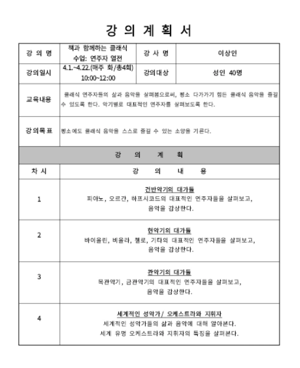 제가 4월에 4회에 걸쳐 용인 수지 도서관에서 <연주자들의 삶과 음악>에 대한 강의를 합니다. 매주 화요일 오전 10~12시입니다. 무료 강의입니다.