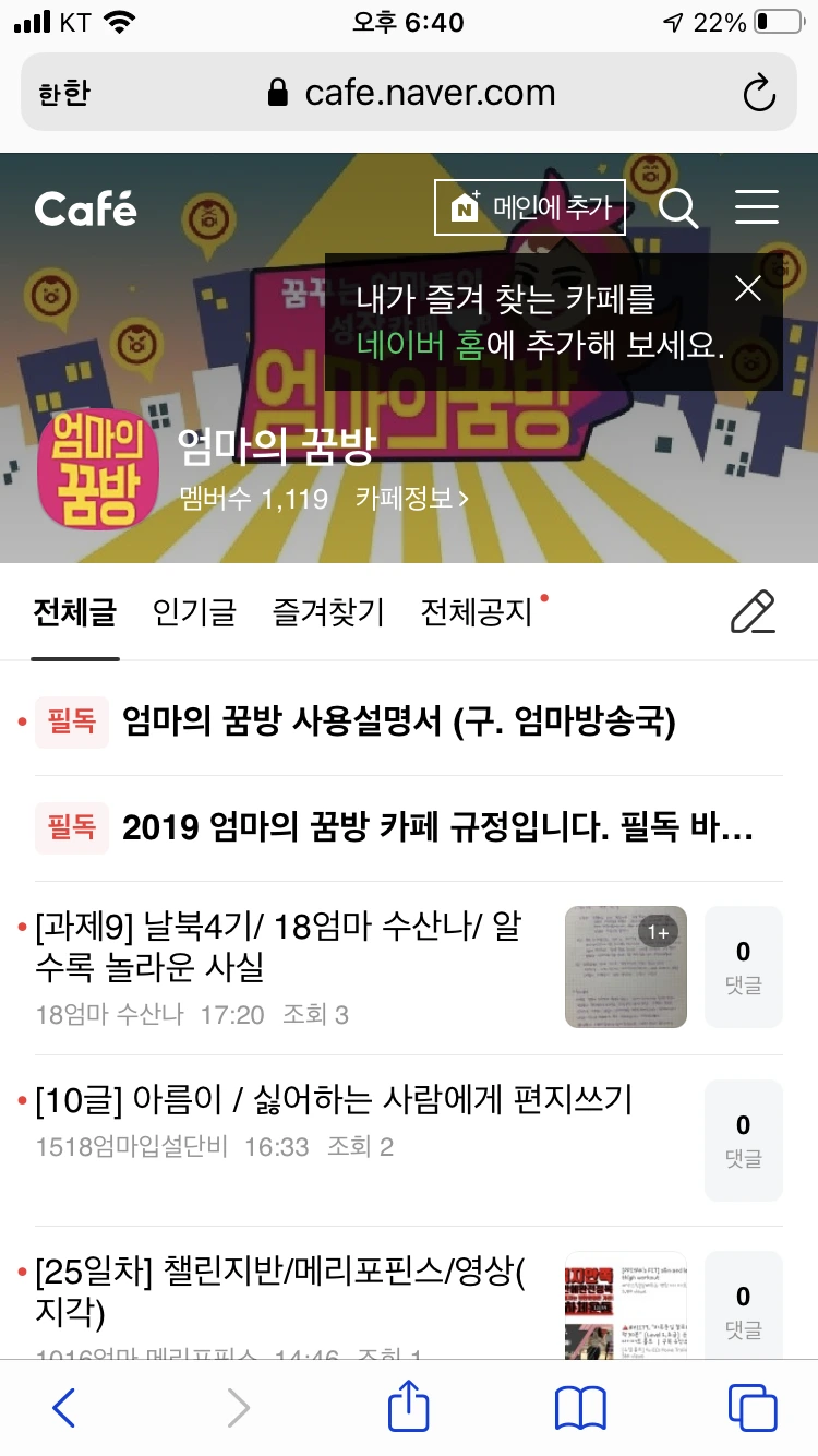 두번째 모임은 <엄마의 꿈방>이라는 카페이다. 여기에는 다양한 스터디가 진행중이다. 엄마들이 독서, 운동, 영어회화, 논어 필사 등 다양한 스터디를 하고 있다. 나는 100일동안 책 10권 읽기 모임을 하고 있다. 한 권 읽을 때마다 서평을 써서 올리면 된다.