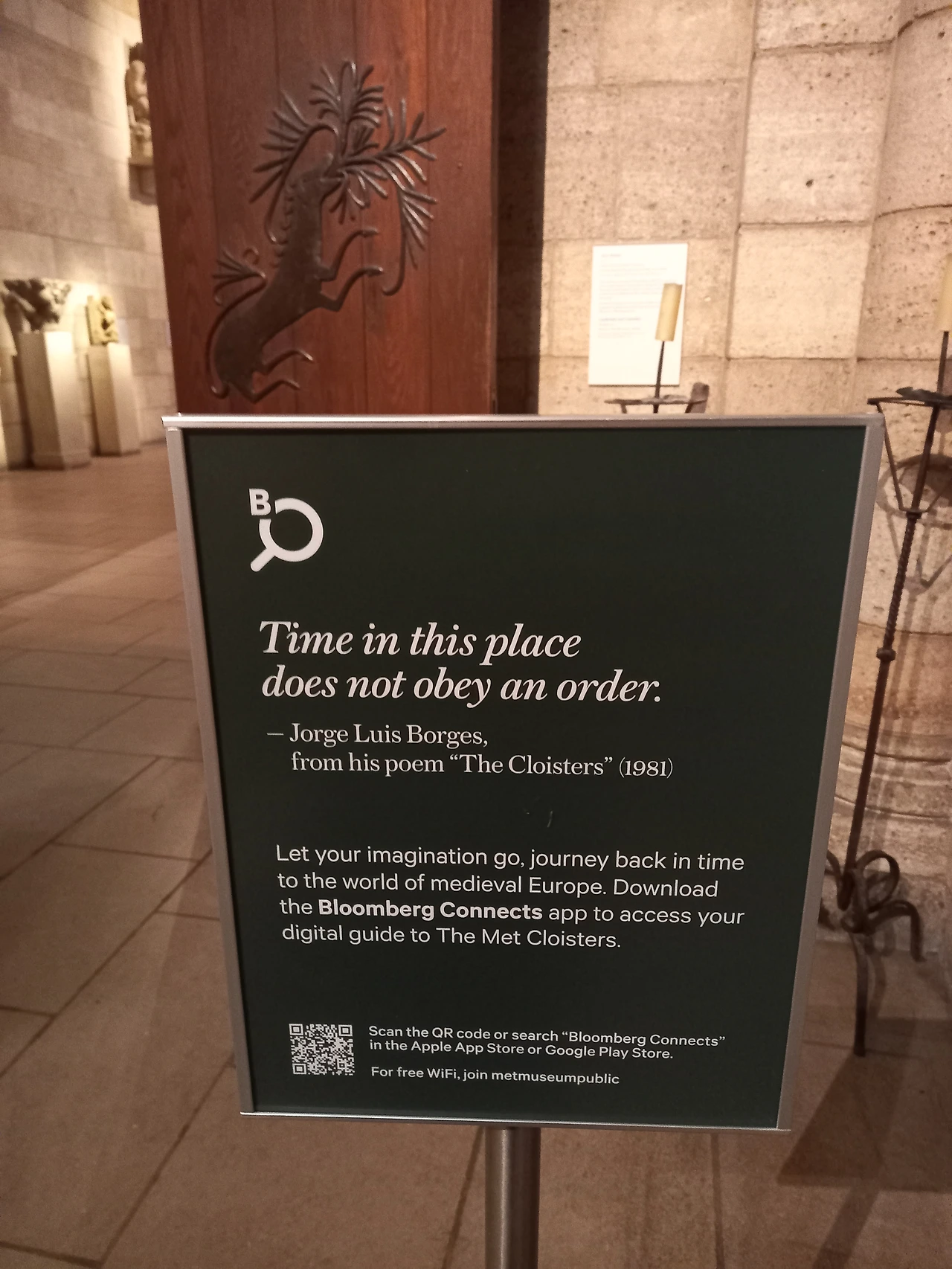 클로이스터스 입구의 팻말에 '클로이스터스'라는 시의 한 구절이 인용돼 있다. 지은이가 무려 보르헤스다. 처음에는 여기 왜 보르헤스의 시를 두었을까 싶었는데, 보르헤스가 뉴욕을 매우 좋아했다더니 여기도 다녀갔구나. 평소 보르헤스의 문학적 재능을 10분의 1이라도 따라가고 싶은 나다. 다시 한번 놀라웠다. 뉴욕에 와서 보르헤스가 지나간 길에 내가 왔다니! 뉴욕이 한 때 세상의 중심이었다는 말은 어느 정도 인정해야 할지도 모르겠다. 세계 문학의 거장이 이 장소를 두고 시를 지어 준 것 아닌가.