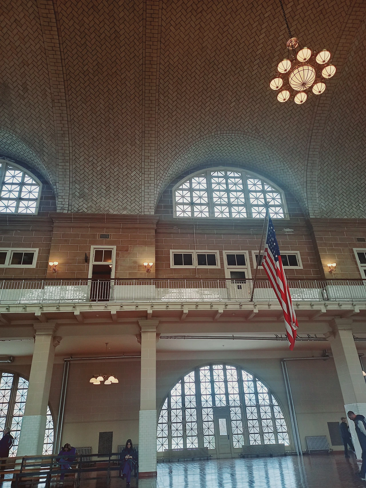 이민의 역사를 담은 기록 영화가 상영 중이어서, 역시 이민자의 후손 멀더는 당연히 봐야 했다. 나는 오늘 다 보지 못할 남은 전시관과 생각할 것이 넘쳐서 잠시 2층 의자에 앉아 있었다. 1800년대 이민자들의 처참한 모습을 목격한 듯한 기분과는 겹쳐지지 않는 바로 그 당시에 지어진 건물이다. 둥근 천장에 유난히 멋있어 보이는 샹들리에다. 앨리스 섬에 내려 입국 심사를 받는 곳이 바로 이 장소라고. <뉴요커>의 기사에 따르면, 청동 샹들리에와 이탈리아 장인이 29,000개의 타일을 한 장씩 인 둥근 천장이 있는 등록사무소라"는, "1800년대 중순 뉴욕에서 가장 으리으리한 장소였다."란다... 한복 입은 여성의 가족은 지금 어디에 뿌리를 내리고 살고 있을까 아주 매우 몹시 궁금하다.
