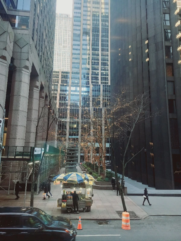 잠시 중간층 휴게실에 앉아 있었다. 맨해튼 길거리에 네모난 노점상이 많은데 유독 이 가게가 눈에 띄었다. 현대 미술관과 어울려 미술의 한 부분으로 느껴졌을까. 길 안쪽에 있는 모마 미술관 앞의 거리는 좁았다. 뒷골목은 더욱 좁았다. 날이 맑아서 하늘은 파랗다. 그런데 높디높은 빌딩이 하늘을 가려놓아서 빌딩 숲에 들어오면 흐린 날씨 같다. 대낮인데 불을 켜 놓아서 내 눈에 띄었나 보다.