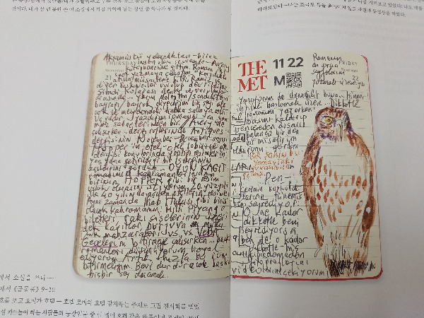 54세에 노벨 문학상을 수상하고 뉴욕에 집필실도 있는 그도 메트로폴리탄박물관(The Met) 방문 표시 스티커는 버리기 아까웠나 보다. (박물관 안에서 The Met스티커를 부착하고 있어야 한다.) 수첩의 귀퉁이에 붙여놓았다. 나도 그랬다. 내 수첩은 부끄러워서 공개할 수 없으나, 내가 좋아하는 작가도 나와 같은 생각을 하는 것도 위로가 된다.
