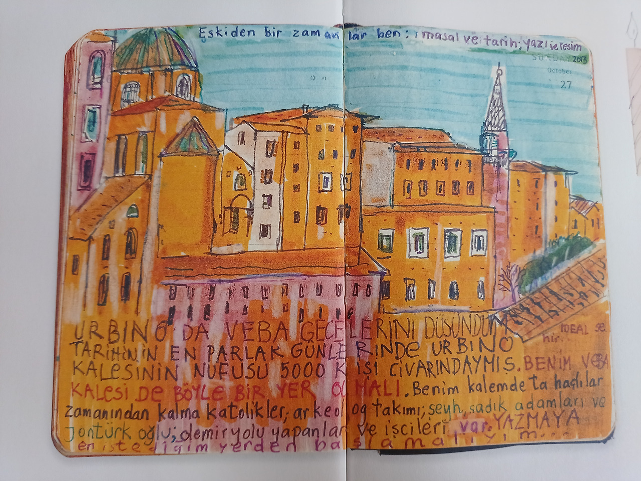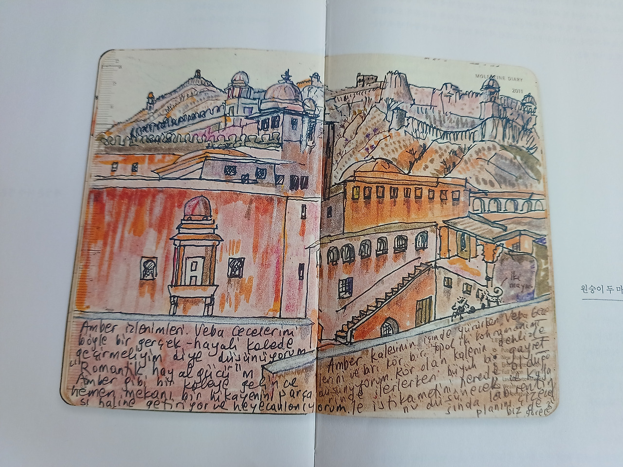 <먼 산의 기억>은 작가는 2009년부터 작은 노트 (몰스킨 다이어리)를 들고 다니면서 일기를 쓰거나 그림을 그린 기록을 엮은, 그림일기다. 14년에 걸친 일상 기록의 분량은 400여 쪽에 이르는 것을 200쪽을 선별하여 엮었다고 한다. 파묵의 여자 친구가 너무 개인적인 것은 출판하지 말라고 조언하는 말까지 실려있다. (p.18) 편집의 의도를 파악하지 못했으나 그림일기의 연도는 뒤 섞여 있다. 한 가지는 분명하다. 노벨상 수상 작가가 '부끄럽다'라고 말하는 것은 정말 반에 반을 접고 다시 접은 후에 들어야 하는 말이다. 일기는 온통 집필 중인 소설에 대한 생각으로 가득 차 있었고 오르한 파묵의 그림은 그의 노벨상 수상작을 연상시켰다. 그런 인상을 나만 받은 것이 아니었다. "아, <내 이름은 빨강>에 나온 세밀화가 같으세요!" (p.26)