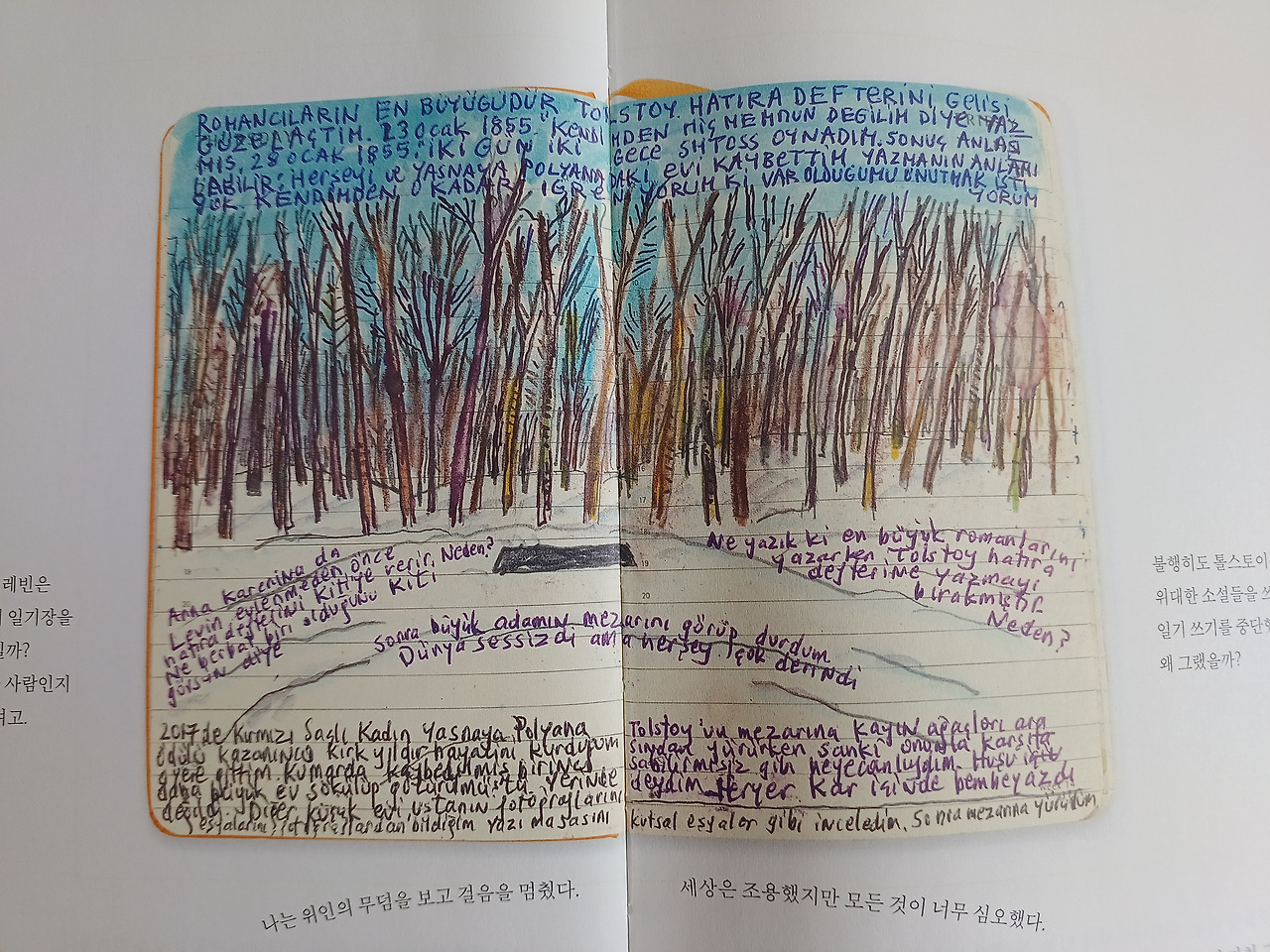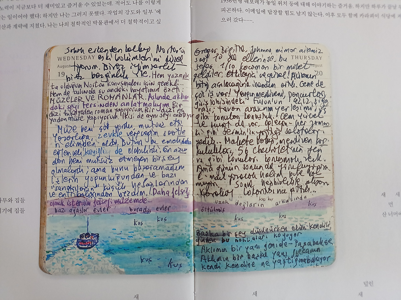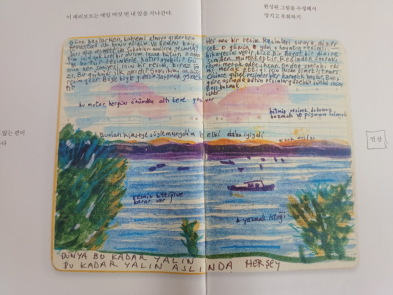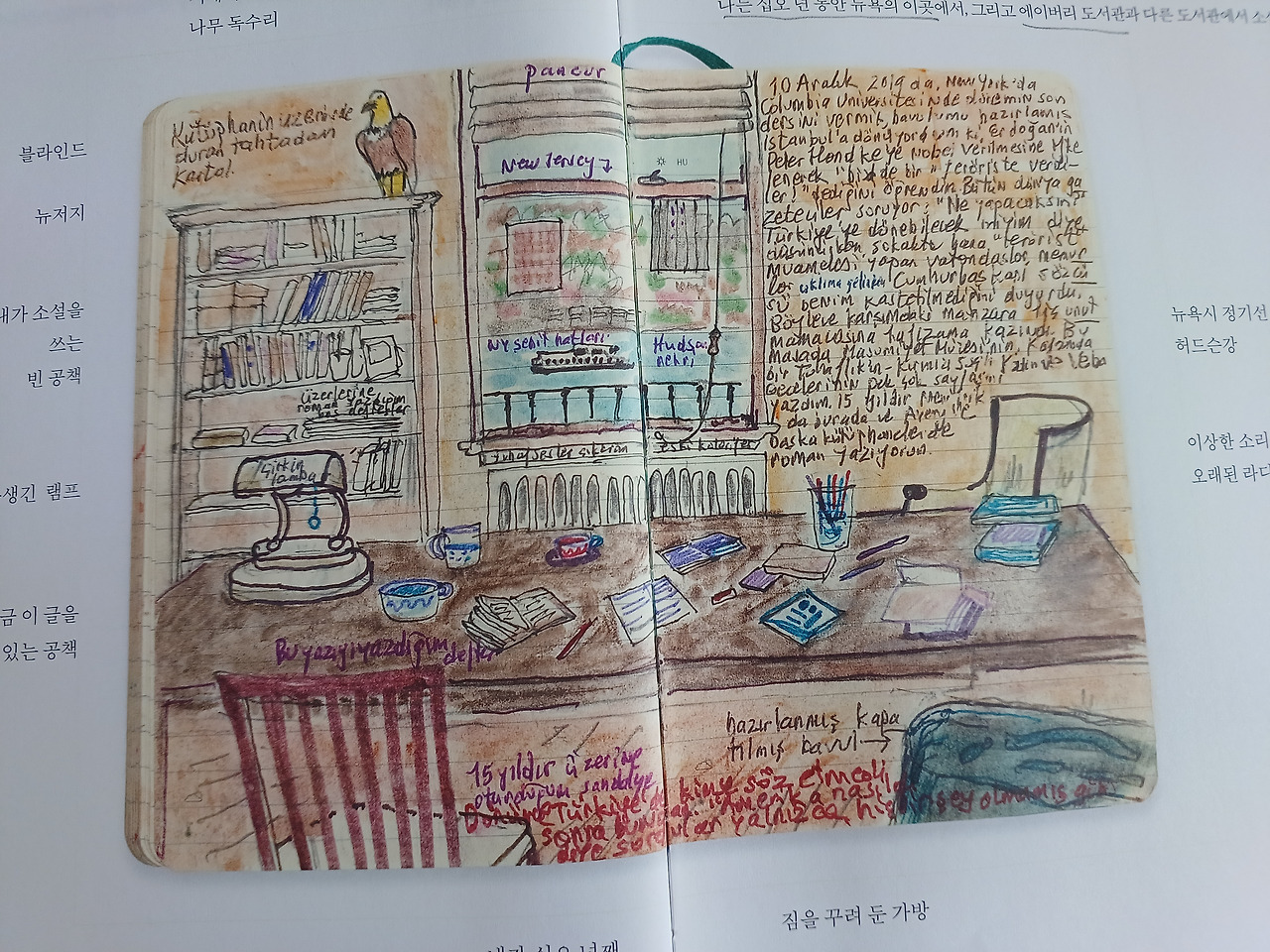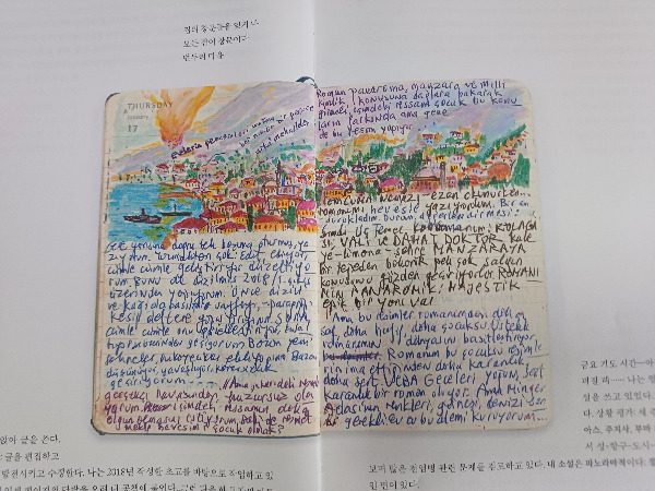 나도 평생 일기를 썼고 지난 일기에 많은 공백이 있다. 나도 간 혹 지나간 일기의 빈 페이지를 한 참이 흐른 후에 채워 넣을 때도 있다. 물론 오르한 파묵의 혼잣말은 나중에 <먼 산의 기억>처럼 의미 있는 내용으로 그림과 어우러지며 또 다른 작품이 되겠지만, 나는 그저 개인의 취미 생활수준이다. 그가 출간 인터뷰를 할 때, 우리 역사의 부끄럽다 못해 참담한 한 페이지가 만천하에 드러나 고개를 들 수 없는 시기였다. 내 일기를 공개할 일은 없으니 부끄러울 일은 거의 없을 것이다. 그럼에도 불구하고 계속 써 나가라는 오르한 파묵의 말은 나에게 깊은 위로가 되었다. 분명히.