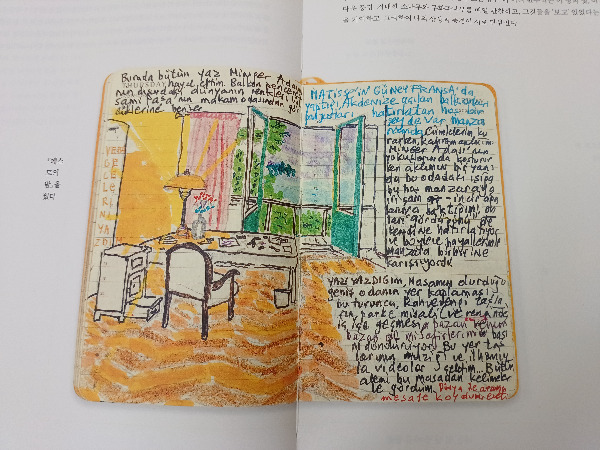 나는 읽을 수 없는 티르기예 어 마저 그림의 일부로 보여 더욱 다채롭다. 오르한 파묵이 <내 이름을 빨강>의 소재는 오스만 제국 시대 세밀 화가들의 이야기인데, 우연히 선택한 소재는 아니었다는 것을 알았다. 화가가 되고 싶었으나, 작가는 '스물두 살에 내 안의 화가를 죽이고 글을 썼다. (p23) '자신이 살고 싶은 화가의 삶으로 넘어가지 못했다.'(p.249) 하지만 오르한 파묵의 그림을 보면 그는 글을 쓰고 있지만 동시에 그 자신 안의 화가는 죽지 않고 계속 그림을 그리며 살아가는 듯하다. 화가로서는 부족하여 나는 글을 계속 쓴다라는 어조인데 그저 푸념(?)으로 들린다.
