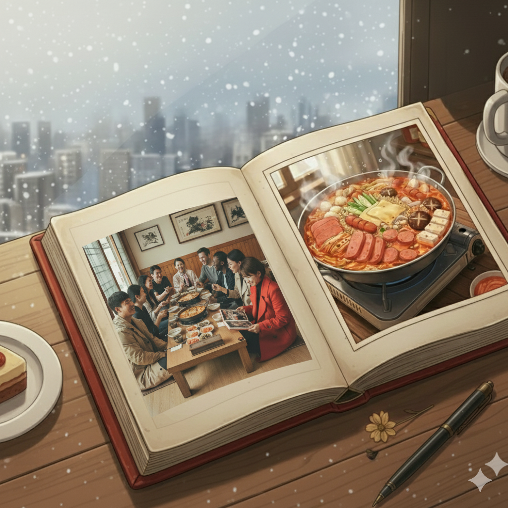 "가마솥에는 햄, 소시지, 다진 고기, 베이컨, 만두, 떡, 그리고 보글보글 끓는 붉은 국물에 담긴 라면이 듬뿍 담겨 있었다."